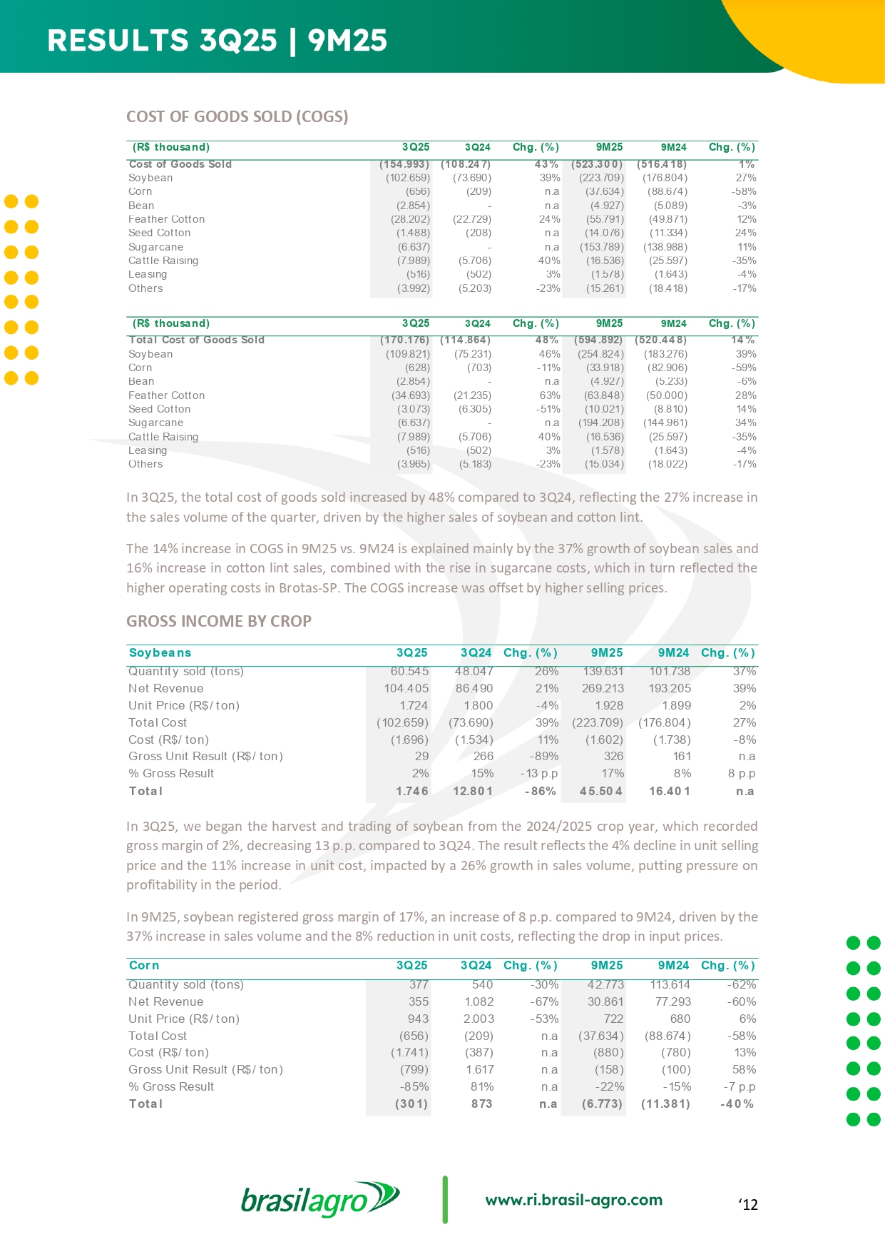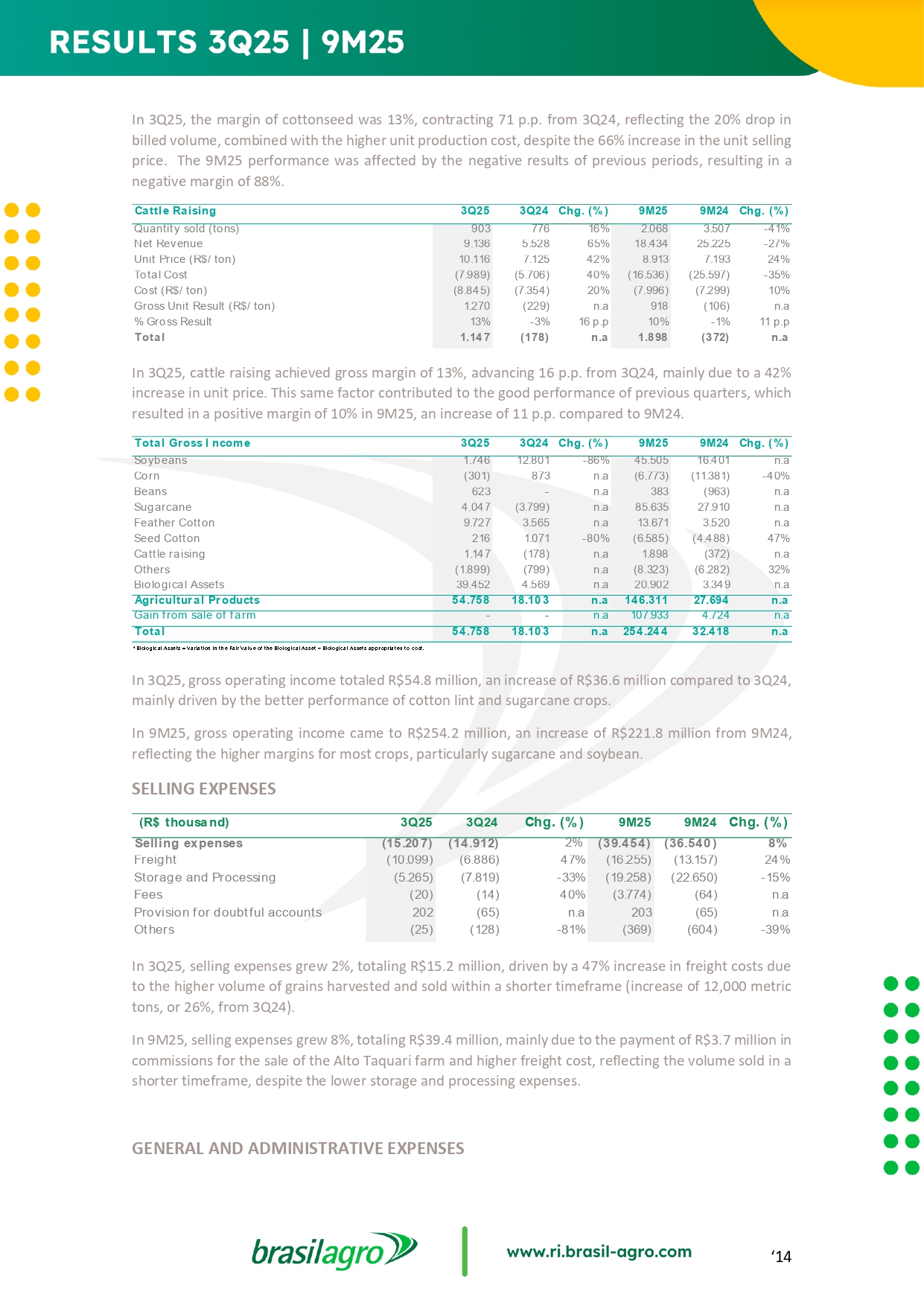 销货成本(COGS)‘12在3 Q25,总销货成本较3 Q24增加48%,反映本季度销量增加27%,受大豆和棉皮棉销量增加带动。9m 25 vs. 9m 24的销货成本增加14%的原因主要是大豆销售增长37%和棉皮棉销售增长16%,再加上甘蔗成本上升,这反过来反映了Brotas-SP较高的运营成本。销货成本的增加被更高的售价所抵消。在3 Q25,我们从2024/2025作物年度开始大豆的收获和交易,录得2%的毛利率,较3 Q24下降13 p. p.。结果反映单位售价下跌4%及单位成本上升11%,受销量增长26%影响,对期内盈利能力造成压力。在9米25,大豆注册毛利率为17%,较9米24增加8便士。受销量增长37%和单位成本下降8%的推动,反映了投入价格的下降。CHG。(%)9m24 9m25 CHG。(%)3Q24 3Q25(千雷亚尔)1%(516.418)(523.300)43%(108.247)(154.993)商品销售成本27%(176.804)(223.709)39%(73.690)(102.659)大豆-58%(88.674)(37.634)n.a(209)(656)玉米-3%(5.089)(4.927)n.a-(2.854)豆12%(49.871)(55.791)24%(22.729)(28.202)羽棉24%(11.334)(14.076)n.a(208)(1.488)籽棉11%(138.988)(153.789)n.a-(6.637)甘蔗(%)9m24 9m25 CHG。(%)3Q24 3Q25(千雷亚尔)14%(520.448)(594.892)48%(114.864)(170.176)总销售成本39%(183.276)(254.824)46%(75.231)(109.821)大豆-59%(82.906)(33.9 18)-11%(703)(628)玉米-6%(5.233)(4.927)n.a-(2.854)豆二8%(50.000)(63.848)63%(21.235)(34.693)羽棉14%(8.8 10)(10.021)-51%(6.305)(3.073)籽棉34%(144.961)(194.208)n.a-(6.637)其他按作物chg计的毛收入。(%)9m24 9m25 CHG。(%)3Q24 3Q25大豆a ns 37% 101.7 38139.63 126% 48.04760.545 Quant ity sold(tons)39% 193.205269.21321% 86.490104.405 Net revenue 2% 1.8991.9 28-4% 1.8001.724 unit price(R $/ton)27%(176.804)(223.709)39%(73.690)(102.659)总成本-8%(1.738)(1.602)11%(1.534)(1.696)成本(R $/ton)n.a 161326-89% 26629 Gross Unit Result(R $/ton)8 p.p 8% 17%-13 p.p 15% 2%% Gross Result n.a 16.40145.504-86% 12.80 11.746 Tota l chch4(%)9m24 9m25 CHG。(%)3Q24 3Q25玉米-62% 113.61 442.773-30% 540377 Quant ity sold(tons)-60% 77.29 330.861-67% 1.08 2355 Net revenue 6% 680722-53% 2.003943 Unit price(R $/ton)-58%(88.674)(37.634)n.a(209)(656)Total cost 13%(780)(880)n.a(387)(1.741)cost(R $/ton)58%(100)(158)n.a 1.617(799)Gross unit result(R $/ton)-7 p.p-15%-22% n.a 81%-85%% Gross result-40%(11.381)(6.773)n.a 873(