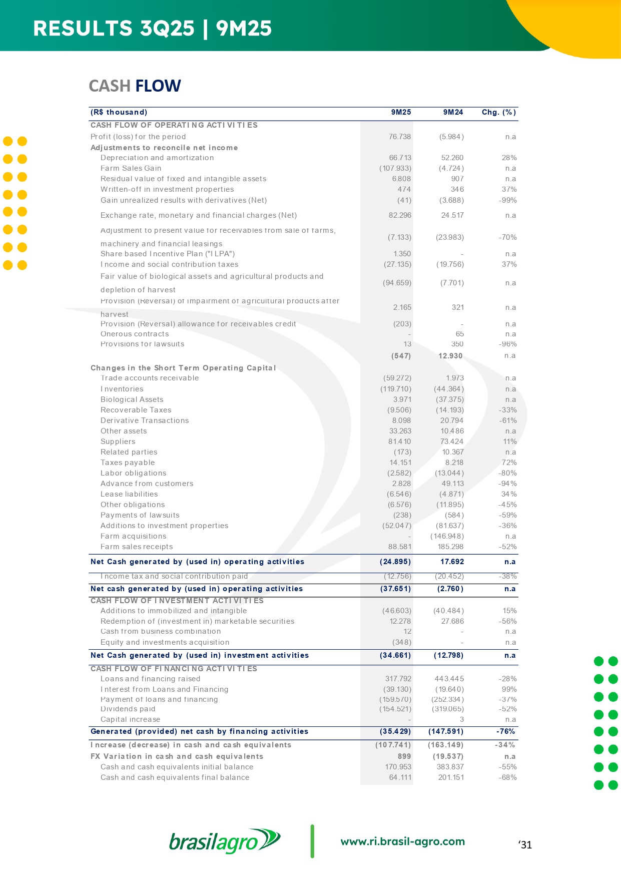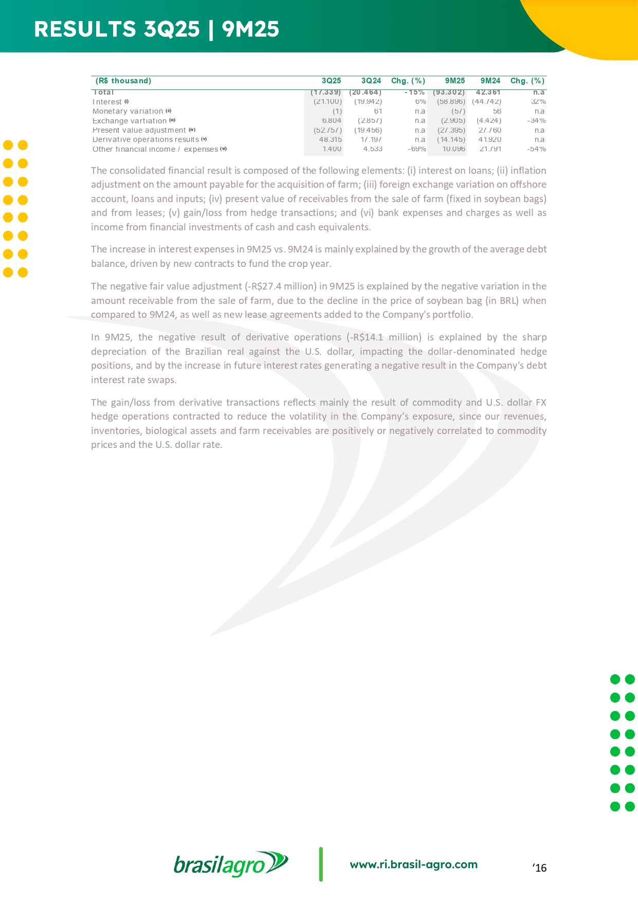 综合财务业绩由以下要素组成:(i)贷款利息;(ii)收购农场应付金额的通货膨胀调整;(iii)离岸账户、贷款和投入的外汇变动;(iv)出售农场(固定在大豆袋中)和租赁的应收款项现值;(v)对冲交易的收益/损失;(vi)银行费用和收费以及现金和现金等价物的金融投资收入。9M 25 vs. 9M 24的利息支出增加主要是由于平均债务余额的增长,这是由为作物年度提供资金的新合同推动的。负的公允价值调整(-27雷亚尔。400万)的原因是出售农场的应收款项出现负变化,原因是大豆袋子(以巴西雷亚尔计)的价格与900万24相比有所下降,以及公司的投资组合中增加了新的租赁协议。在9 m25,衍生工具操作的负结果(-14雷亚尔。100万)的原因是巴西雷亚尔对美元大幅贬值,冲击了以美元计价的对冲头寸,以及未来利率上升对公司的债务利率互换产生了负面结果。衍生品交易的收益/损失主要反映了商品和美元外汇对冲操作收缩的结果,以降低公司风险敞口的波动性,因为我们的收入、库存、生物资产和农场应收账款与商品价格和美元汇率呈正相关或负相关。‘16公斤。(%)9m24 9m25 CHG。(%)3Q24 3Q25(千雷亚尔)n.a 42.361(93.302)-15%(20.464)(17.339)合计32%(44.742)(58.896)6%(19.942)(21.100)i nterest(i)n.a 56(57)n.a 61(1)货币变动(ii)-34%(4.424)(2.905)n.a(2.857)6.80 4汇兑增值(iii)n.a 27.760(27.395)n.a(19.456)(52.757)现值调整(iv)n.a 41.9 20(14.145)n.a 17.19748.315衍生业务结果(v)-54% 21.79 110.096-69% 4.53 31.400其他f金融