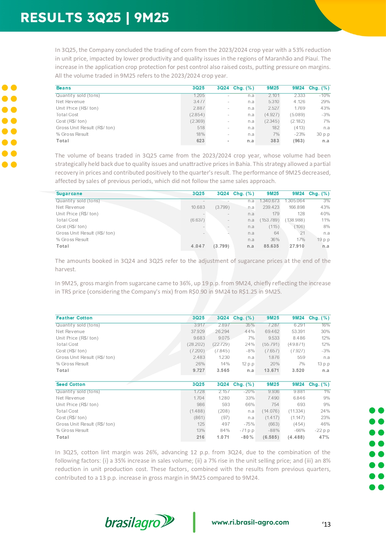 25年第三季度的豆类交易量来自2023/2024作物年度,由于质量问题和巴伊亚州缺乏吸引力的价格,该年度的交易量一直受到战略性抑制。这一策略让价格出现了部分复苏,并对本季度的业绩做出了积极贡献。9M25业绩下降,受前期销售影响,未按相同销售方式。3Q24和3Q25的入帐金额是指收割结束时甘蔗价格的调整。9M25,甘蔗的毛利率达到36%,较9M24上升19个百分点,主要反映了TRS价格(考虑公司的组合)从9M24的0.90雷亚尔上涨至9M25的1.25雷亚尔。25年第三季度,皮棉利润率为26%,较24年第三季度提高12个百分点,原因是以下因素综合在一起:(i)销量增加35%;(ii)单位售价上升7%;(iii)单位生产成本下降8%。这些因素,再加上前几个季度的业绩,促使9M 25的毛利率比9M 24增长了13个p. p.。25年第三季度,受Maranh ã o和Piau í地区生产力和质量问题下降的影响,公司完成了2023/2024作物年度的玉米交易,单价降低了53%。为控制虫害而增加的应用作物保护也提高了成本,给利润率带来压力。所有成交量在9M25指的是2023/2024作物年度。Bea ns 3 Q 253 Q 24 chg。(%)9 m 25 9 m 24 chg。(%)2.333-10% 2.10 1-n.a 1.205销售数量(吨)4.12 629% 5.3 10-n.a 3.477净收入1.76943% 2.527-n.a 2.887单位价格(R/吨)(5.089)-3%(4.927)-n.a(2.854)总成本(2.18 2)7%(2.345)-n.a(2.369)成本(R/吨)(413)n.a 182-n.a 518毛单位结果(R/吨)-23% 30 p.p 7%-n.a 18%%毛结果(963)n.a 383-n.a 623总chg。(%)9m24 9m25 CHG。(%)3Q24 3Q25 Suga rca ne 3% 1.305.06 41.340.673 n.a--售出数量(吨)43% 166.89 8239.423 n.a(3.799)10.683净收入40% 128179 n.a--单价(R $/ton)11%(138.988)(153.789)n.a-(6.637)总成本8%(106)(115)n.a--成本(R $/ton)n.a 2164 n.a--总单位结果(R $/ton)19 p.p 17% 36% n.a % Gross Result n.a 27.9 1085.635 n.a(3.799)4.047 tota l‘13 chg。(%)9m24 9m25 CHG。(%)3Q24 3Q25 Fea ther Cotton 16% 6.29 17.28735% 2.89 73.917 Quant ity sold(tons)30% 53.39 169.46 244% 26.29437.9 29 Net revenue 12% 8.48 69.53 37% 9.07 59.683 Unit price(R $/ton)12%(49.871)(55.791)24%(22.729)(28.202)Total cost-3%(7.9 27)(7.657)-8%(7.845)(7.200)Cost(R $/ton)n.a 5591.876 n.a 1.2302.483 Gross unit result(R $/ton)13 p.p 7% 20% 12 p.p 14% 26%% Gross result n.a 3.52013.671 n.a 3.5659.727 tota(%)9m24 9m25 CHG。(%)3Q243Q25籽棉1% 9.88 19.936-20% 2.1571.728销售数量(吨)9% 6.8467.49033% 1.2801.704净收入9% 69375466% 593986单价(R/吨)24%(11.334)(14.076)n.a(208)(1.488)总成本23%(1.147)(1.417)n.a(97)(861)成本(R/吨)46%(454)(663)-75% 497125毛单位结果(R/吨)-22 p.p-66%-88%-71 p.p84 % 13%%毛结果47%(4.488)(6.585)-80% 1.07 1216总