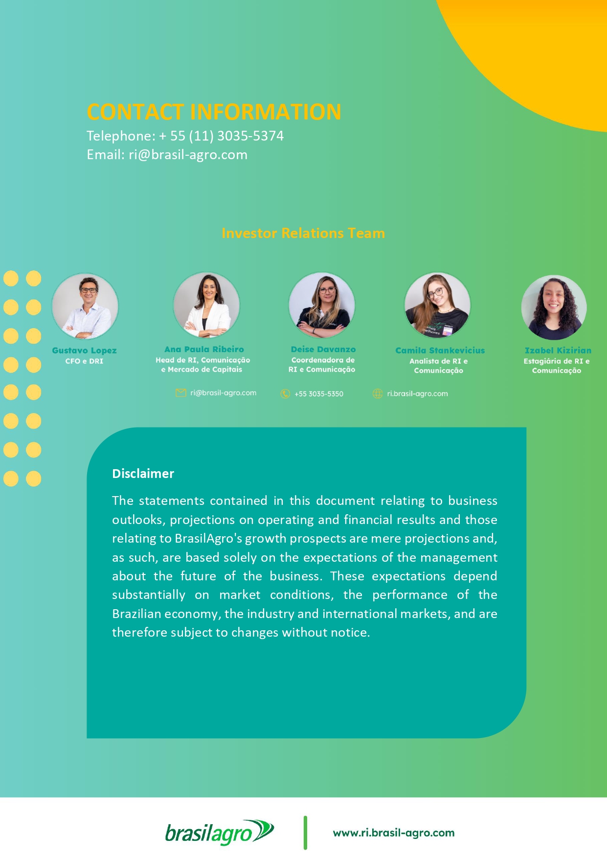 ‘23联系信息电话:+ 55(11)3035-5374邮箱:ri@brasil-agro.com投资者关系团队免责声明本文件中包含的与业务前景、经营和财务业绩预测以及与BrasilAgro增长前景相关的陈述仅为预测,因此完全基于管理层对业务未来的预期。这些预期在很大程度上取决于市场状况、巴西经济表现、行业和国际市场,因此可能会发生变化,恕不另行通知。