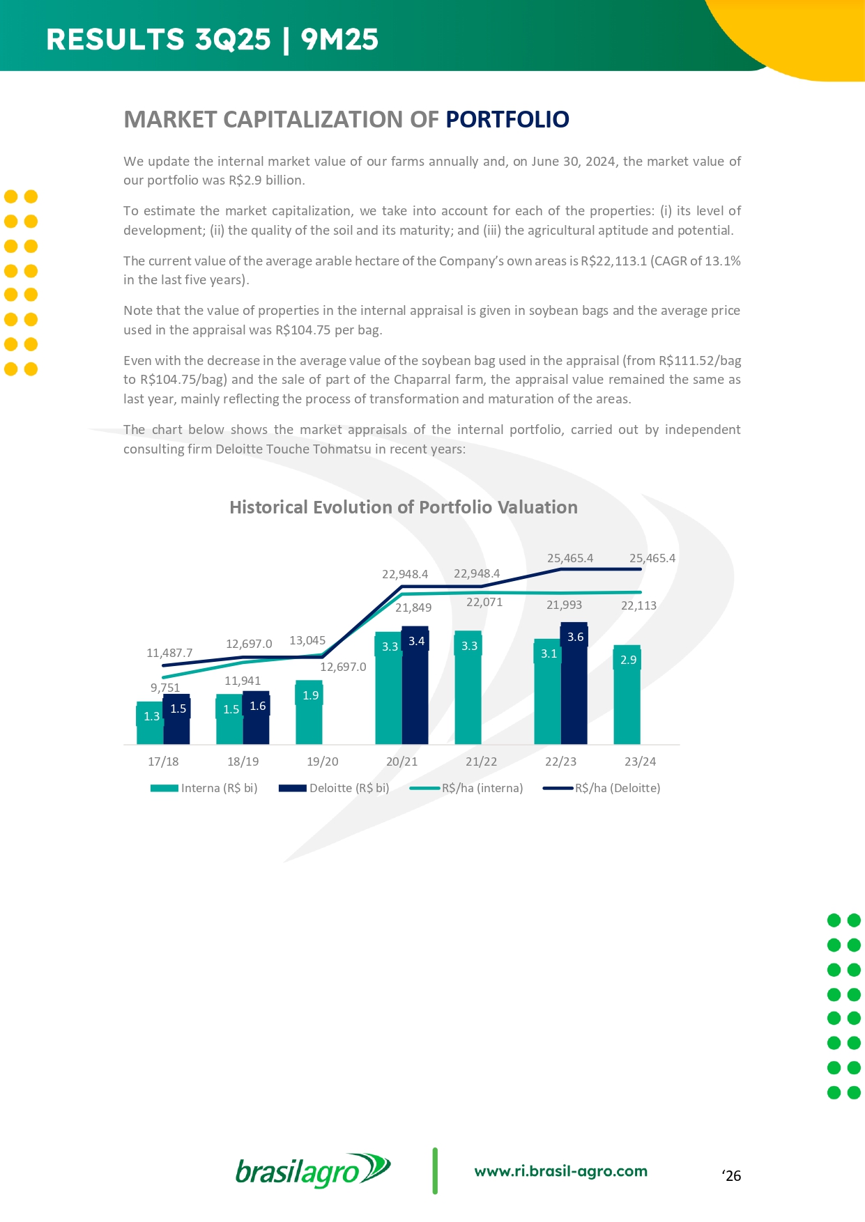 1.3 1.5 1.9 3.3 3.3 3.1 2.9 1.5 1.6 3.4 3.69,75111,94113,04521,84922,07121,99322,11311,487.712,697.012,697.022,948.422,948.425,465.425,465.417/1818/1921/22投资组合的市场资本化我们每年更新我们农场的内部市值,在2024年6月30日,我们投资组合的市值为2雷亚尔。90亿。为了估算市值,我们考虑了每一种属性:(i)其发展水平;(ii)土壤质量及其成熟度;(iii)农业资质和潜力。目前公司自有地区平均耕地公顷价值为22,113雷亚尔。1(复合年增长率为13。最近五年为1%)。请注意,内部评估中的物业价值以大豆袋为单位给出,评估中使用的平均价格为104雷亚尔。每袋75。即使评估中使用的大豆袋的平均价值有所下降(从111雷亚尔。52/袋至104雷亚尔。75/袋)和出售部分Chaparral农场,评估值与去年持平,主要反映了该地区的改造和成熟进程。下图展示了内部投资组合的市场评估,由独立咨询公司德勤华永近年来进行:投资组合估值的历史演变Interna(R $ bi)19/2020/21德勤(R $ bi)R $/ha(interna)22/2323/24 R $/ha(Deloitte)‘26