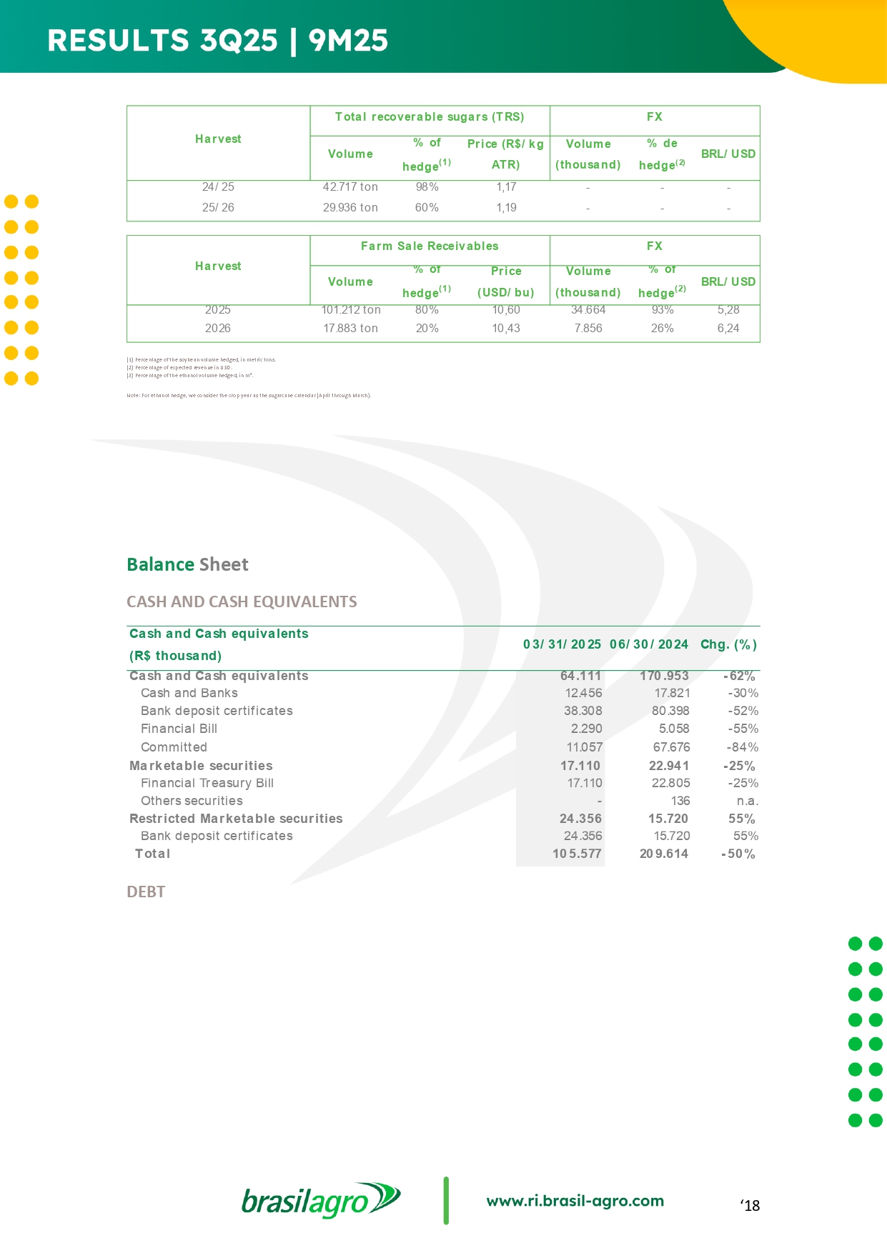 (1)对冲的大豆量百分比,单位:公吨。(2)美元预期收入占比。(3)乙醇量套期保值百分比,单位:m φ。注:对于乙醇对冲,我们将作物年度视为甘蔗历(4月至3月)。资产负债表现金和现金等价物债务外汇总可回收糖(TRS)Harvest BRL/USD % de hedge(2)成交量(千)价格(R $/kg ATR)% of hedge(1)成交量---1,1798% 42.7 17吨24/25---1,1960% 29.936吨25/26外汇农场销售应收款Harvest BRL/USD % of hedge(2)成交量(千)价格(USD/BU)% of hedge(1)成交量5,2893% 34.66 410,6080% 101.212吨20256,2426% 7.85610,4320% 17.883吨2026 Ca SH a nd Ca SH equiva lents(R $ thousand)03/31/202506/30/2024 Chg。(%)-62 % 170.95 364.11 1 Ca SH A nd Ca SH equiva lents-30% 17.82 112.456 Cash and banks-52% 80.39838.308 Bank deposit certif icates-55% 5.058 2.290 Financial bills-84% 67.67611.057 Committed-25% 22.94 117.110 Ma rketa ble securities-25% 22.80 517.110 Financial Treasury Bill n.a. 136-Others securities 55% 15.7 2024.356 Restricted Ma rketa ble securities 55% 15.7 2024.356 Bank deposit certif icates-50% 209.61 4105.577 Tota l ' 18