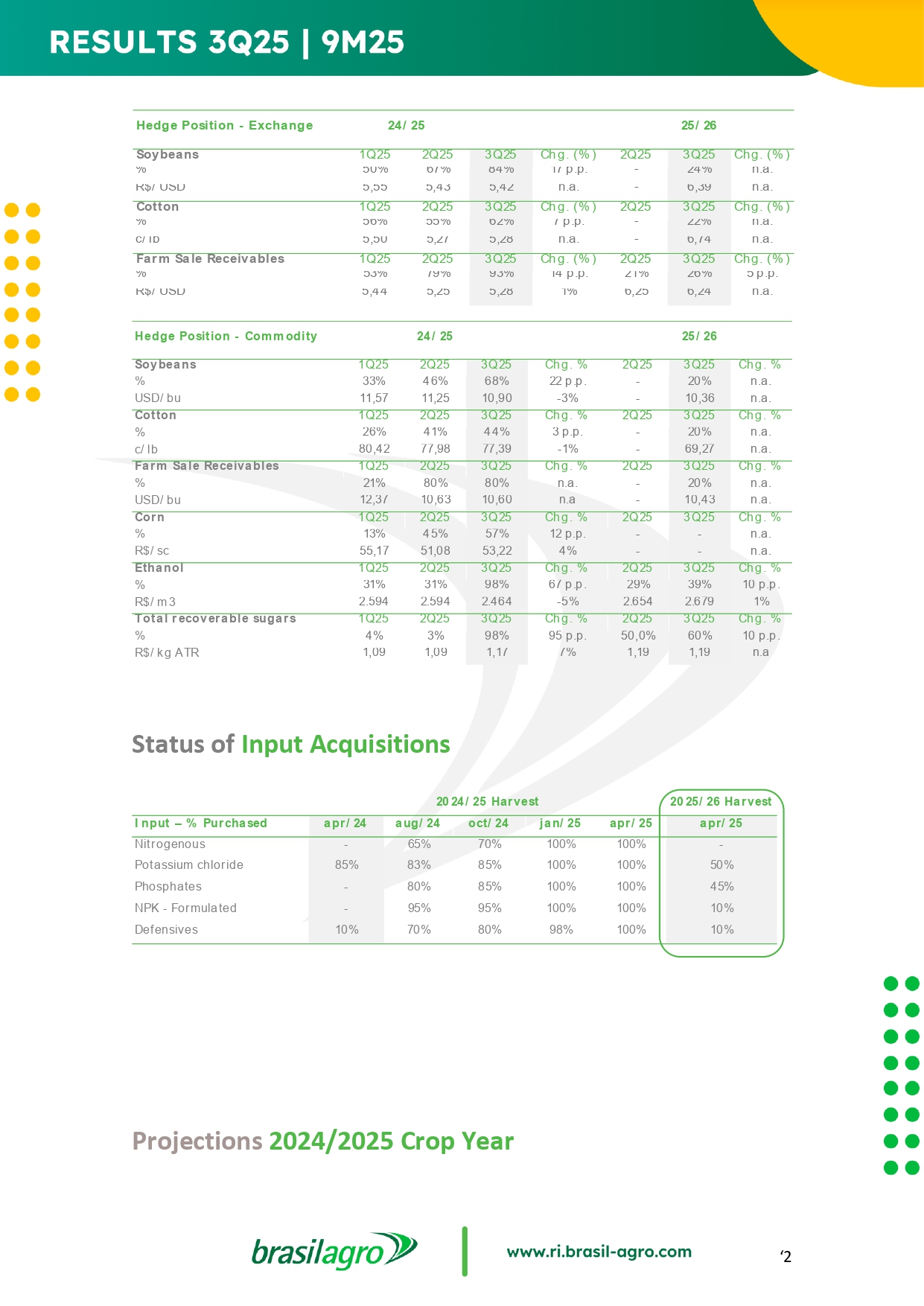 投入获取情况预测2024/2025作物年度25/26对冲头寸-交易所24/25CHG。(%)3Q25 2Q25 CHG。(%)3Q25 2Q25 1Q25大豆n.a. 24% 84% 17 p.p.-67% 50%% n.a. 6,39 n.a.-5,425,435,55 R $/USD CHG。(%)3Q25 2Q25 CHG。(%)3Q25 2Q25 1Q25棉花n.a. 22% 62% 7 p.p.-55% 56%% n.a. 6,74 n.a.-5,285,275,50 c/lb CHG。(%)3Q25 2Q25 CHG。(%)3Q25 2Q25 1Q25农场销售应收账款5 p.p. 26% 93% 21% 14 p.p. 79% 53%% n.a. 6,246,251% 5,285,255,44 R $/USD 25/2624/25对冲头寸-商品CHG。% 3Q25 2Q25 CHG。% 3Q25 2Q25 1Q25大豆n.a. 20%-22 p.p. 68% 46% 33%% n.a. 10,36--3% 10,9011,2511,57美元/bu CHG。% 3Q25 2Q25 CHG。% 3Q25 2Q25 1Q25棉花n.a. 20%-3 p.p. 44% 41% 26%% n.a. 69,27--1% 77,3977,9880,42 c/lb CHG。% 3Q25 2Q25 CHG。% 3Q25 2Q25 1Q25农场销售应收账款n.a. 20%-n.a. 80% 80% 21%% n.a. 10,43-n.a. 10,6010,6312,37美元/bu CHg。% 3Q25 2Q25 CHG。% 3Q25 2Q25 1Q25玉米n.a.--12 p.p. 57% 45% 13%% n.a.--4% 53,2251,0855,17 R $/SC CHG。% 3Q25 2Q25 CHG。% 3Q25 2Q25 1Q25乙醇10 p.p. 39% 29% 67 p.p. 98% 31% 31% 31% 1% 2.679 2.654-5% 2.464 2.594 2.594 R $/m 3 CHG。% 3Q25 2Q25 CHG。% 3Q25 2Q25 1Q25总可回收糖10 p.p. 60% 50,0% 95 p.p. 98% 3% 4%% n.a 1,191,197% 1,171,091,09R $/kg ATR 2025/26 Harvest 2024/25 Harvest apr/25 apr/25 jan/25 oct/24 aug/24 apr/24 i nput –% purchased-100% 100% 70% 65%-含氮50% 100% 100% 85% 83% 85%氯化钾45% 100% 100% 85% 80%-磷酸盐10% 100% 100% 95% 95%-NPK-配制10% 100% 98% 80% 70% 10% def ensiv es ' 2