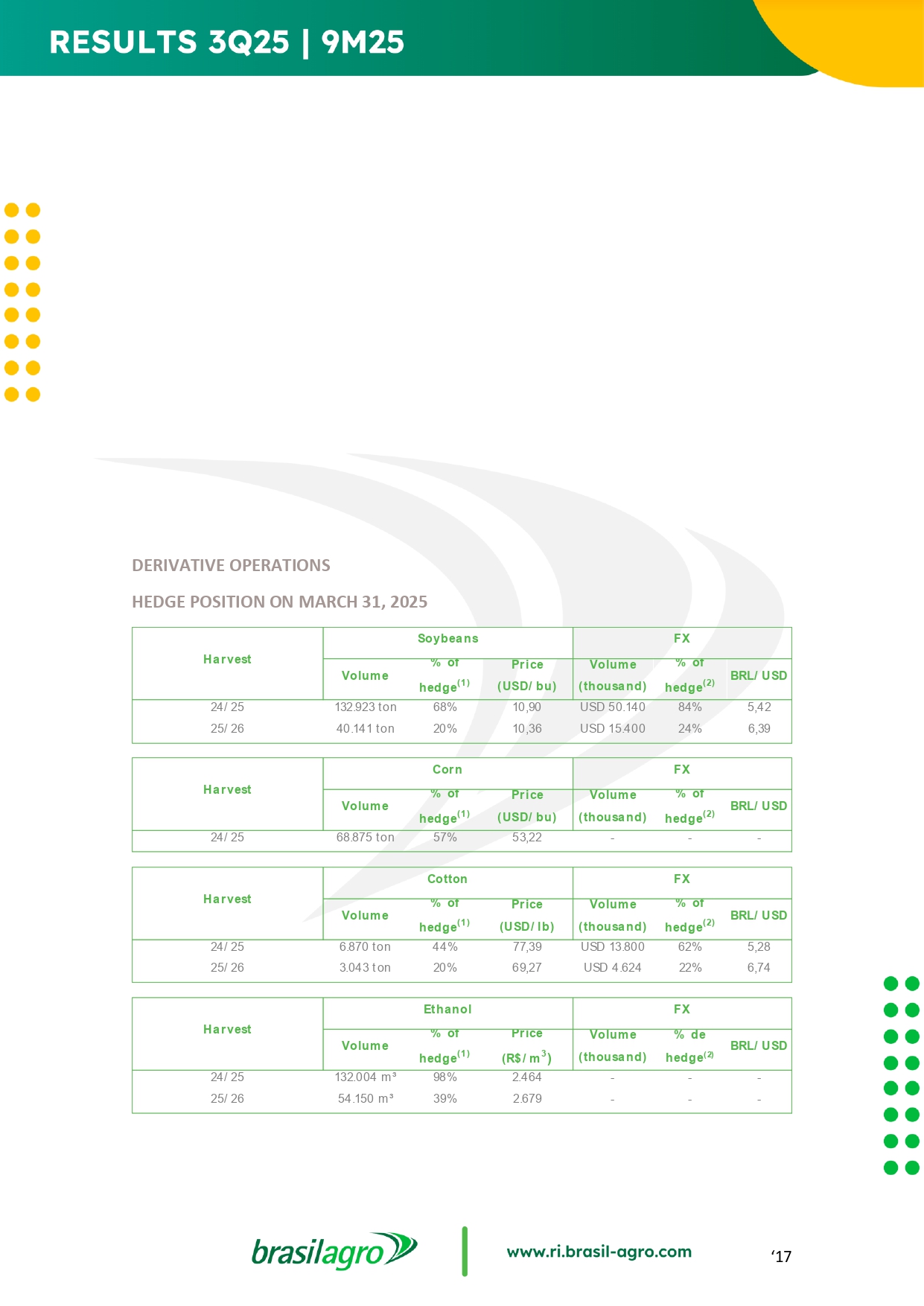 3月31日衍生品操作对冲头寸,2025 ' 17 FX Soybeans Harvest BRL/USD % of hedge(2)Volume(thousand)Price(USD/bu)% of hedge(1)Volume 5,4284% USD 50.14010,9068% 13 2.92 3 t 24/256,3924% USD 15.40010,3620% 40.14 1 t 25/26 FX Corn Harvest BRL/USD % of hedge(2)Volume(thousand)Price(USD/bu)% of hedge(1)Volume---53,2257% 68.875 t 24/25 FX Cotton Harvest BRL/USD % of hedge(2)Volume(thousand)Price(USD/lb)% of hedge(144% 6.870吨24/256,7422%美元4.62 469,2720% 3.043吨25/26外汇Ethanol Harvest BRL/USD % de hedge(2)成交量(千)价格(R $/m 3)% of hedge(1)成交量---2.46 498% 132.004 m φ 24/25---2.67 939% 54.150 m φ 25/26