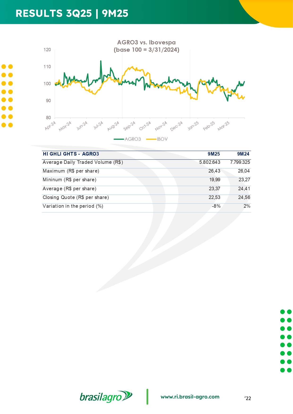1101009080120 AGRO3 vs. Ibovespa(base 100 = 3/31/2024)IBOV AGRO3 9m24 9m25 HI GHLI GHTS-AGRO3 7.7 99.3255.80 2.643平均每日交易量(R $)26,0426,43最大值(R $ per share)23,2719,99 Mininum(R $ per share)24,4123,37 Average(R $ per share)24,5622,53 Closing Quote(R $ per share)2%-8% period variation(%)' 22