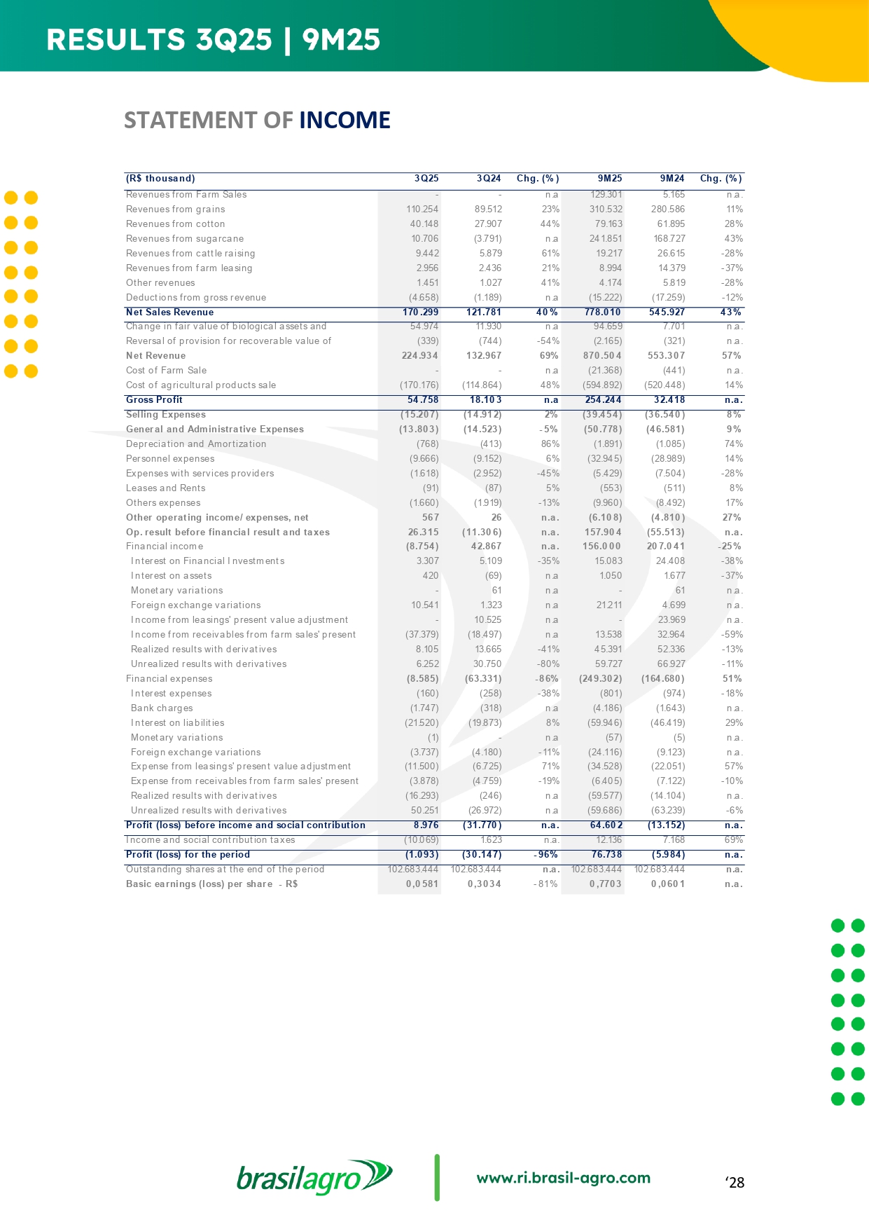 损益表(千雷亚尔)3Q25 3Q24 CHG。(%)9m25 9m24 CHG。(%)5.16 5 n.a. 12 9.301-n.a-收入f rom农场销售280.58611% 310.53 289.5 1223% 110.254收入f rom谷物61.89 528% 79.16 327.90 744% 40.14 8收入f rom棉花168.7 2743% 241.851(3.791)n.a 10.706收入f rom甘蔗26.6 15-28% 19.2175.87 961% 9.442收入f rom牛饲养14.379-37% 8.9942.43621% 2.956收入f rom农场租赁5.8 19-28% 4.17 41.02741% 1.451其他收入(17.259)-12%(15.22 2)(1.189)n.a(4.658)扣除f rom毛收入43% 545.9 27778.0 1040% 12收入7.701 n.a. 94.65911.930 n.a 54.974生物资产公允价值变动和(321)n.a.(2.165)(744)-54%(339)可收回价值拨备转回55 3.30757% 870.50413 2.96 769% 224.934净收入(441)n.a.(21.368)-n.a-农场销售成本(520.448)14%(594.892)(114.864)48%(170.176)农产品销售成本n.a. 32.418254.24 4 n.a 18.10 354.758毛利润(36.540)8%(39.454)(14.9 12)2%(15.207)销售费用(46.581)9及管理费用(1.085)74%(1.891)(413)86%(768)折旧及摊销(28.989)14%(32.945)(9.15 2)6%(9.666)人事费(7.504)-28%(5.429)(2.952)-45%(1.618)与服务供应商的费用(511)8%(553)(87)5%(91)租赁及租金(8.492)17%(9.960)(1.9 19)-13%(1.660)其他费用(4.8 10)27%(6.108)26 n.a. 567其他营业收入/支出,net(55.513)n.a. 15 7.904(11.306)n.a. 26.315 op.财务业绩前业绩税收207.04 1-25% 156.0042.867 n.a.(8.754)财务收益24.408-38% 15.08 35.109-35% 3.307 i nterest on financial i novestments 1.677-37% 1.050(69)n.a 420 i nterest on assets 61 n.a.-61 n.a-货币变动4.699 n.a. 21.2 111.323 n.a 10.541外汇变动23.969 n.a.-10.525 n.a-i ncome f rom leasings现值调整32.964-59% 13.538(18.497)n.a(37.379)i ncome f rom rom receivables f rom farm sales ' present 52.336-13% 45.39 113.665-41% 8.105已实现业绩与衍生工具66.9 27-11% 59.7 2730.750-80% 6.252未变现业绩含衍生工具(164.680)51%(249.302)(63.331)-86%(8.585)财务费用(974)-18%(801)(258)-38%(160)利息费用(1.643)不适用(4.186)(318)不适用(1.747)银行手续费(46.419)29%(59.946)(19.873)8%(21.520)负债利息(5)不适用(57)-不适用(1)货币变动(9.123)不适用(24.116)(4.180)-11%(3.737)外汇变动(22.051)57%(34.528)(6.725)71%(11.11)销售'现值(14.104)n.a.(59.577)(246)n.a(16.293)已实现业绩含衍生工具(63.239)-6%(59.686)(26.972)n.a 50.251未实现业绩含衍生工具n.a.(13.152)64.602 n.a.(31.770)8.976收入和社会贡献前利润(亏损)7.16869% 12.136 n.a. 1.623(10.069)i ncome及社会贡献税n.a.(5.984)76.738-96%(30.147)(1.093)期内溢利(亏损)n.a. 102.68 3.44 4102.68 3.44 4 n.a. 102.68 3.44 4102.68 3.44 4期末流通股n.a. 0,06010,7703-81% 0,30340,0581每股基本盈利(亏损)-R $ ' 28