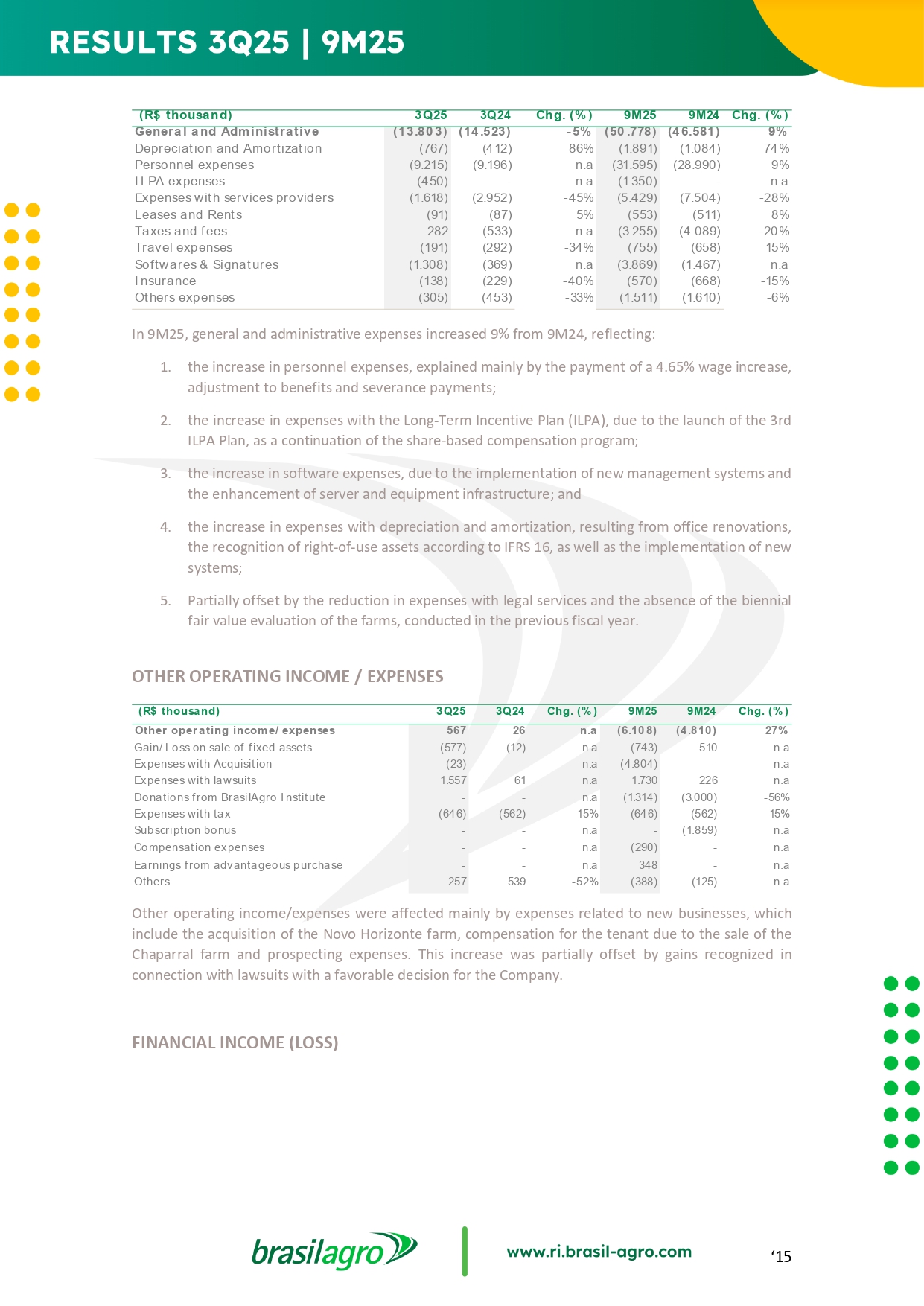 9M25,一般及行政开支较9M24增加9%,反映:1.人员开支增加,主要由支付4所致。工资增长65%,调整福利和遣散费;2.与长期激励计划(ILPA)的费用增加,是由于第三个ILPA计划的推出,作为基于股份的补偿计划的延续;3.软件费用增加,是由于实施了新的管理系统以及加强了服务器和设备基础设施;以及4.与折旧和摊销的费用增加,是由于办公室装修,根据IFRS 16确认使用权资产,以及新制度的实施;5。部分被法律服务费用的减少和没有上一财年进行的两年一次的农场公允价值评估所抵消。其他营业收入/支出其他营业收入/支出主要受与新业务相关的费用影响,这些费用包括收购Novo Horizonte农场、因出售Chaparral农场而对租户的补偿以及探矿费用。这一增长被与对公司有利的决定的诉讼相关的确认收益部分抵消。财务收入(亏损)(千雷亚尔)3 Q25 3Q24 CHG。(%)9m25 9m24 CHG。(%)(46.581)9%(50.778)(14.523)-5%(13.803)一般和行政(1.084)74%(1.891)(412)86%(767)折旧和摊销(28.990)9%(31.595)(9.196)n.a(9.215)人事费用-n.a(1.350)-n.a(450)I LPA费用(7.504)-28%(5.429)(2.952)-45%(1.618)与服务提供商的费用(511)8%(553)(87)5%(91)租赁和租金(4.089)-20%(3.255)(533)n.a 282税及费用(658)15%(755)(292)-34 %(191)差旅费(1.467)n.a(3.869)(369)n.a(1.308)软件和签名(668)-15 %(570)(229)-40 %(138)i nsurance(1.6 10)-6 %(1.511)(453)-33 %(305)其他费用chg。(%)9m24 9m25 CHG。(%)3Q24 3Q25(R $ thousand nd)27%(4.8 10)(6.108)n.a 26567其他Opera ting收入/支出n.a 510(743)n.a(12)(577)出售f ixed资产损益n.a-(4.804)n.a-(23)与收购有关的费用n.a 2261.730 n.a 611.557与诉讼有关的费用-56%(3.000)(1.314)n.a--捐赠f rom BrasilAgro i nstitute 15%(562)(646)15%(562)(646)含税费用n.a(1.859)-n.a--认购红利n.a-(290)n.a--补偿费用n.a-348rom优势购n.a(125)(388)-52% 539257其他‘15