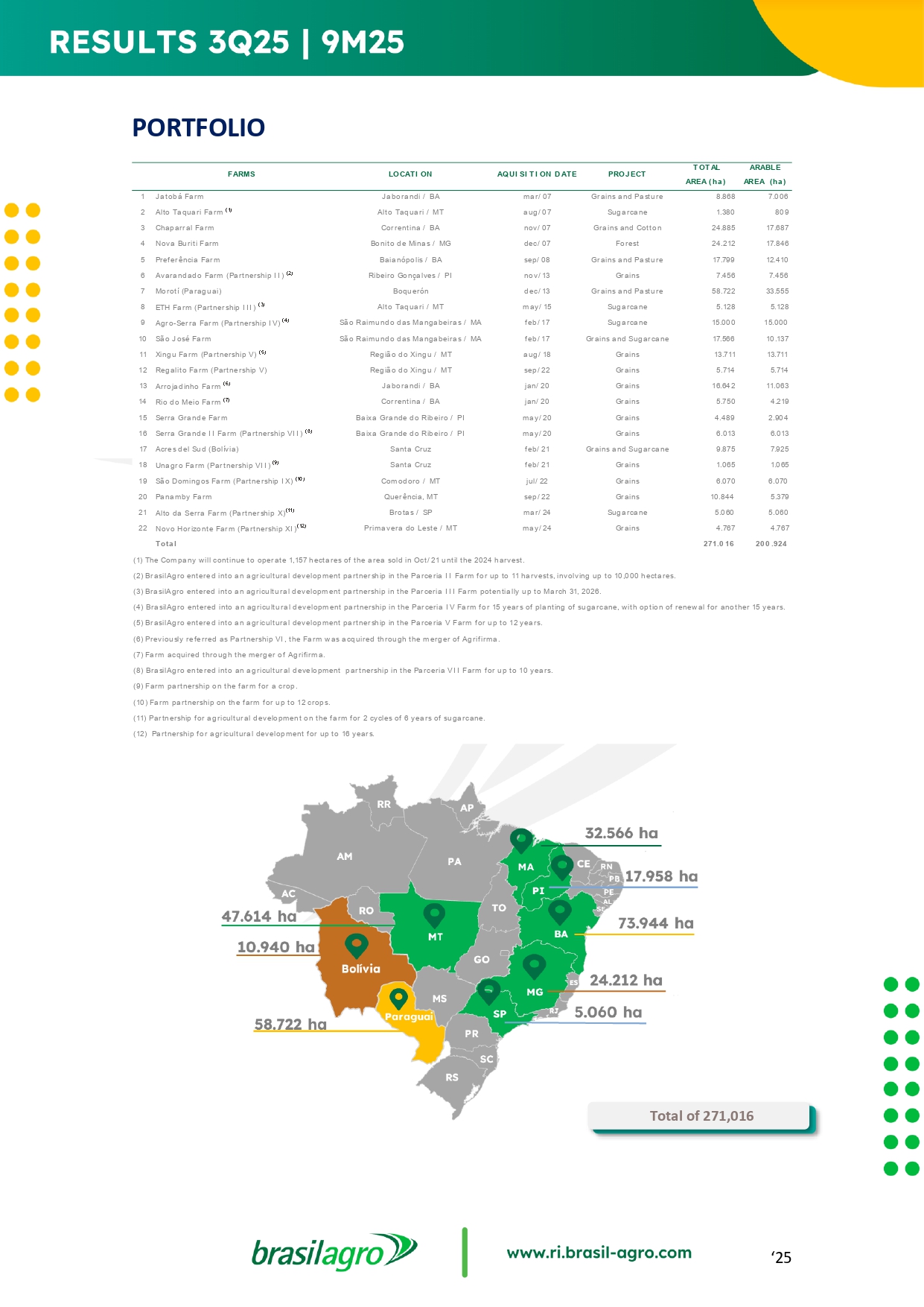 AQUI SI TI ON DATE Project Area(ha)Area(ha)7.00 68.868 Grains and Pasture mar/07 J aborandi/BA 1 J atob á Farm 8091.380 Sugarcane aug/07 Alto Taquari/MT 2 Alto Taquari Farm(1)17.68 724.885 Grains and Cotton nov/07 Correntina/BA 3 Chaparral Farm 17.84624.212 Forest dec/07 Bonito de Minas/MG 4 Nova Buriti Farm 12.4 1017.7 99 Grains和牧场sep/08 Baian ó polis/BA 5 Prefer ê ncia Farm 7.4567.456 Grains nov/13 Ribeiro Gon ç alves/PI 6 Avarandado Farm(Partnership I I)(2)33.55558.72 2 Grains and Pasture dec/13 Boquer ó n 7 Morot í(Paraguai)5.12 85.12 8 Sugarcane may/15 Alto Taquari/MT 8 ETH Farm(Partnership I I I)(3)15.00015.000 Sugarcane feb/17 S ã o Raimundo das Mangabeiras/MA 9 Agro-Serra Farm(Partnership I V)(4)10.13717.566 Grains和甘蔗feb/17 S ã o Raimundo das Mangabeiras/MA 10 S ã o J OS é Farm 13.71 113.7 11 Grains aug/18 Regi ã o do Xingu/MT 11 Xingu Farm(Partnership V)(5)5.71 45.7 14 Grains sep/22 Regi ã o do Xingu/MT 12 Regalito Farm(Partnership V)11.06 316.642 Grains jan/20 J aborandi/BA 13 Arrojadinho Farm(6)4.2195.750 Grains jan/20 correntina/BA 14 Rio do Meio Farm(7)2.90 44.489 Grains May/20 Baixa Grande do Ribeiro/PI 15 Serra Grande Farm 6.01 36.01 3 GraSerra Grande I I农场(伙伴关系VI I)(8)7.9 259.875谷物和甘蔗feb/21 Santa Cruz 17 acres del Sud(Bol í via)1.06 51.065谷物feb/21 Santa Cruz 18 Unagro农场(伙伴关系VI I)(9)6.07 06.070谷物jul/22 Comodoro/MT 19 S ã o Domingos农场(伙伴关系I X)(10)5.37910.84 4谷物sep/22 Quer ê ncia,MT 20 Panamby农场5.0 605.060甘蔗mar/24 Brotas/SP 21 Alto da Serra农场(合伙X)(11)4.76 74.767 Grains may/24 Primavera do Leste/MT 22 Novo Horizonte农场(合伙XI)(12)200.92 4271.016 Total(1)公司将继续经营21年10月出售的面积中的1,157公顷,直至2024年收获。(2)BrasilAgro在Parceria I I农场建立农业发展伙伴关系,收获多达11次,涉及多达10,000公顷。(3)BrasilAgro可能在2026年3月31日之前在Parceria I I I农场建立农业发展伙伴关系。(4)BrasilAgro在Parceria I V农场建立农业发展伙伴关系,种植甘蔗15年,可选择再延长15年。(5)BrasilAgro在Parceria V农场建立了长达12年的农业发展伙伴关系。(6)此前称为合伙企业VI,农场是通过合并Agrifirma获得的。(7)通过Agrifirma合并获得的农场。(8)BrasilAgro在Parceria VI I农场建立了长达10年的农业发展伙伴关系。(九)农场上的农场合伙换一茬庄稼。(10)农场上的农场伙伴关系,最多可种植12种作物。(11)6年甘蔗2个周期农场农业发展伙伴关系。(12)长达16年的农业发展伙伴关系。合计271,016‘25