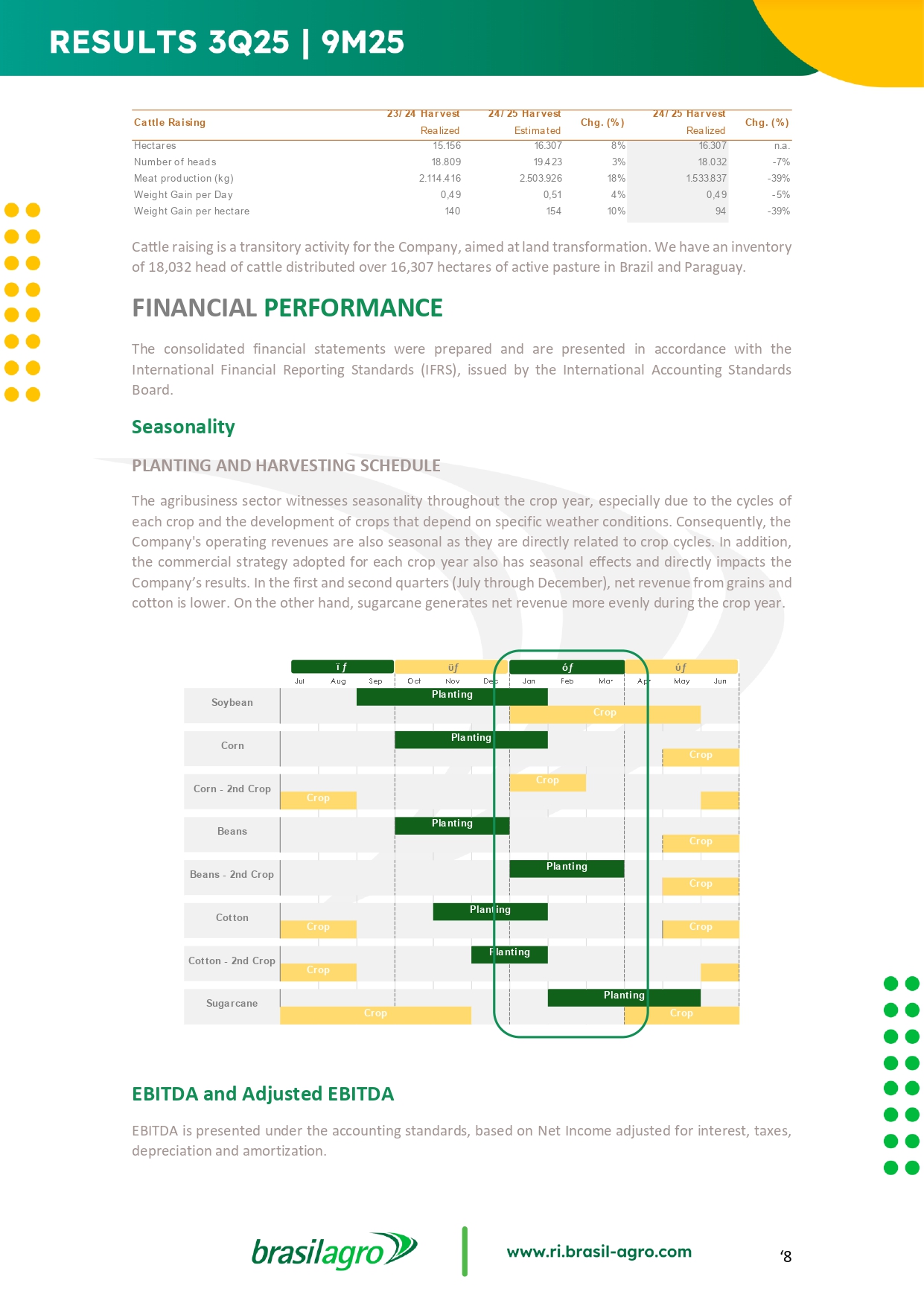 养牛对公司来说是一种暂时性的活动,旨在进行土地改造。我们有18,032头牛的库存,分布在巴西和巴拉圭的16,307公顷活跃牧场上。财务表现合并财务报表是根据国际会计准则理事会颁布的国际财务报告准则(IFRS)编制和列报的。季节性种植和收获时间表农业综合企业部门在整个作物年度见证季节性,特别是由于每种作物的周期和作物的发展取决于特定的天气条件。因此,该公司的营业收入也具有季节性,因为它们与作物周期直接相关。此外,每个作物年度所采取的商业策略也有季节性影响,直接影响公司的业绩。在第一和第二季度(7月至12月),来自谷物和棉花的净收入更低。另一方面,甘蔗在作物年度更平均地产生净收入。EBITDA和调整后EBITDA EBITDA根据会计准则列报,基于经利息、税项、折旧和摊销调整后的净收入。24/25 Ha rvest 24/25 Ha rvest chg。(%)CHG。(%)23/24 Ha rvest ca ttle ra ising已实现估计已实现n.a. 16.3078% 16.30715.156公顷-7% 18.03 23% 19.42 318.809头数-39% 1.53 3.83 718% 2.50 3.9 262.11 4.416肉产量(公斤)-5% 0,494% 0,510,49每日增重-39% 9410% 154140每公顷增重Jul Sep Oct Dec JanMarApr Jun Crop甘蔗种植作物作物种植棉花-第二季作物棉花种植作物豆豆-第二季作物种植作物作物作物玉米-第二季作物玉米种植大豆种植作物Crop ï f Aug ó f Feb ü f Nov ú f May‘8