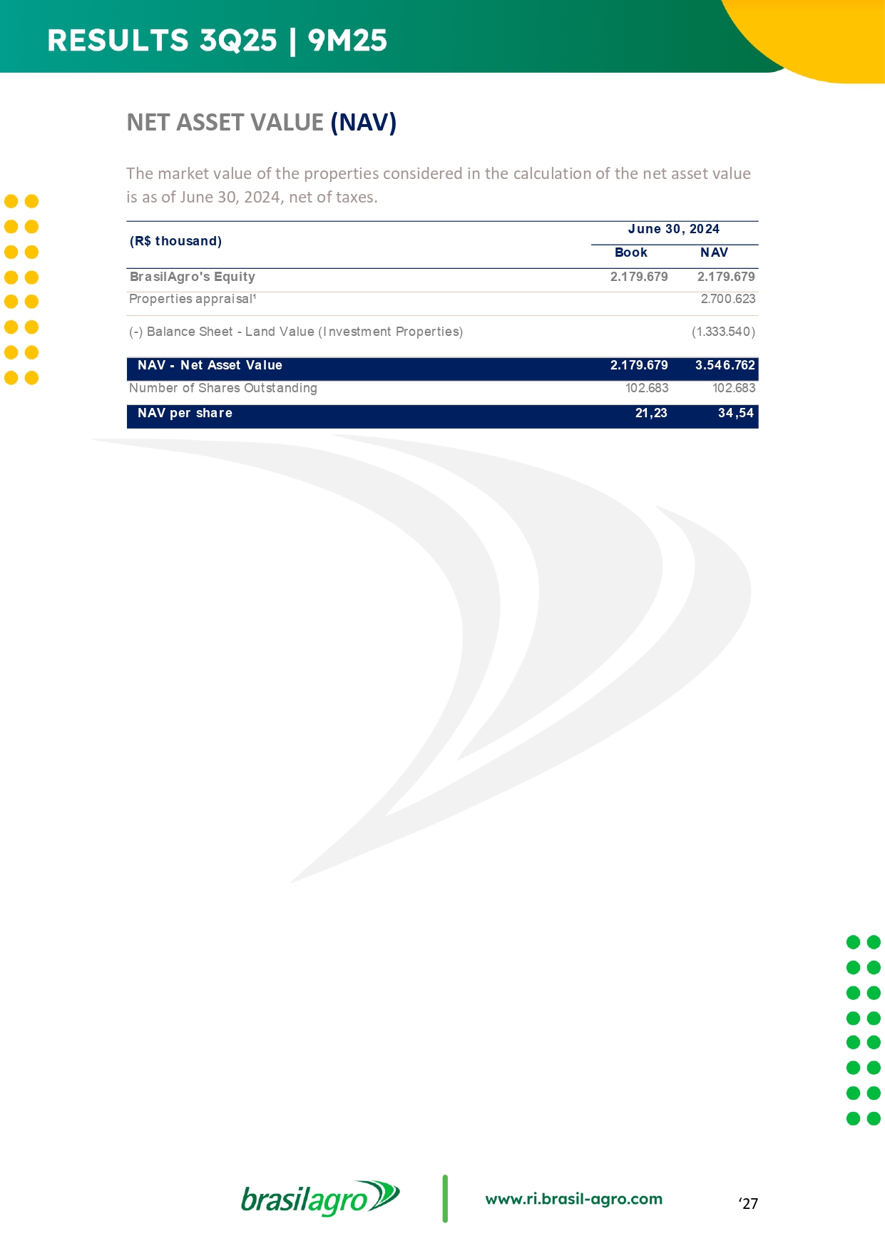资产净值(NAV)‘27在计算资产净值时所考虑的物业的市值为截至2024年6月30日的税后净额。2024年6月30日(千雷亚尔)NAV账簿2.17 9.67 92.17 9.679 BrasilAgro股权2.70 0.623物业评估值丨(1.33 3.540)(-)资产负债表-土地价值(i novestment properties)3.5 46.76 22.17 9.679 NAV-资产净值102.68 3102.683已发行股份数量34,5421,23每股NAV
