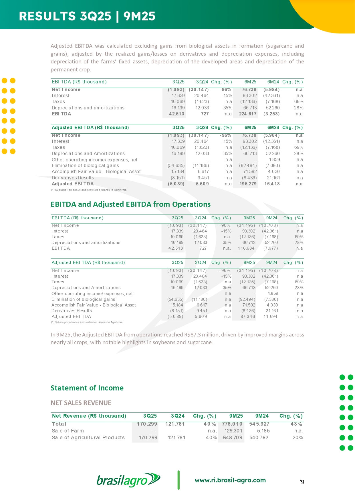 调整后EBITDA的计算不包括形成中的生物资产(甘蔗和谷物)的收益,经衍生品和折旧费用的已实现收益/损失调整,包括农场固定资产的折旧、发达地区的折旧和永久作物的折旧。EBITDA和运营调整后EBITDA在9M25,运营调整后EBITDA达到8730万雷亚尔,这得益于几乎所有作物的利润率都有所提高,其中大豆和甘蔗有显着亮点。损益表净销售收入chg。(%)6m24 6m25 CHG。(%)3Q24 3Q25 EBI TDA(R $ t hou sa nd)n.a(5.984)76.738-96%(30.147)(1.093)Net i ncome n.a(42.361)93.302-15% 20.46 417.339 i nterest 69%(7.168)(12.136)n.a(1.623)10.069税收28% 52.26066.71 335% 12.03 316.199折旧和摊销n.a(3.253)224.617 n.a 72742.513 EBI TDA CHG。(%)6m24 6m25 CHG。(%)3Q24 3Q25调整后EBI TDA(千雷亚尔)n.a(5.984)76.738-96%(30.147)(1.093)净i ncome n.a(42.361)93.302-15% 20.46 417.339 i nterest 69%(7.168)(12.136)n.a(1.623)10.069税项28% 52.26066.71 335% 12.03 316.199折旧和摊销n.a 1.859-n.a--其他营业收入/支出,net 1 n.a(7.380)(92.494)n.a(11.186)(54.635)消除生物收益n.a 4.03071.592 n.a 6.61 715.18 4完成公允价值-生物资产n.a 21.16 1(8.436)n.a 9.451(8.151)衍生品结果n.a 16.4 18195.279 n.a 5.609(5.089)调整EBI TDA(1)子股tion bonus and restricted sha res to Agrifirma CHG。(%)9m24 9m25 CHG。(%)3Q24 3Q25 EBI TDA(R $ t hou sa nd)n.a(10.708)(31.195)-96%(30.147)(1.093)Net I ncom e n.a(42.361)93.302-15% 20.46 417.339 i nterest 69%(7.168)(12.136)n.a.(1.623)10.069税收28% 52.26066.71 335% 12.03 316.199折旧和摊销n.a(7.977)116.684 n.a. 72742.513 EBI TDA CHG。(%)9m24 9m25 CHG。(%)3Q24 3Q25 Adjusted EBI TDA(R $ t hou sa nd)n.a(10.708)(31.195)-96%(30.147)(1.093)net I ncom e n.a(42.361)93.302-15% 20.46 417.339 i nterest 69%(7.168)(12.136)n.a(1.623)10.069税收28% 52.26066.71 335% 12.03 316.199折旧和摊销n.a 1.859-n.a--其他营业收入/支出,净值1 n.a(7.380)(92.494)n.a(11.186)(54.635)消除生物收益n.a 4.03071.592 n.a 6.6 1715.18 4实现公允价值-生物资产n.a 21.16 1(8.436)n.a 9.451(8.151)衍生品结果n.a 11.69487.346 n.a 5.609(5.089)调整ed EBI TDA(1)子股t离子红利和限制性sha res to Agrifirma净收入(千雷亚尔)3Q25 3Q24 chg。(%)9m25 9m24 CHG。(%)545.9 2743% 778.0 1040% 121.78 1170.299合计5.16 5 n.a. 12 9.30 1 n.a.--出售农场540.76 220% 648.70 940% 121.78 1170.299出售农产品' 9