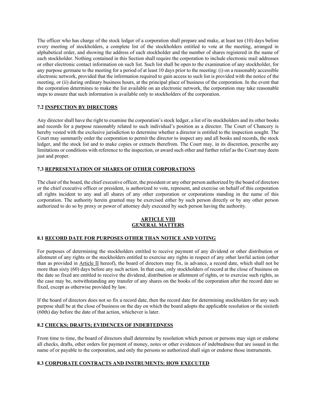 主管公司股票分类账的主管人员应当在每次股东大会召开前至少十(10)天编制并制作有权在大会上投票的股东的完整名单,按字母顺序排列,并显示每个股东的地址和登记在每个股东名下的股份数量。本条并不要求法团将电子邮件地址或其他电子联络资料列入该名单。该名单应在会议召开前至少10天内开放供任何股东审查,用于与会议密切相关的任何目的:(i)在合理可访问的电子网络上,条件是获得该名单所需的信息随同会议通知一起提供,或(ii)在正常营业时间内,在公司的主要营业地点提供。如法团决定在电子网络上提供该名单,法团可采取合理步骤,确保该等资料只提供予法团的股东。7.2董事的检查任何董事均有权为与该个人的董事职位合理相关的目的,检查公司的股票分类账、股东名单及其其他账簿和记录。衡平法院特此被授予专属管辖权,以确定董事是否有权接受所寻求的检查。法院可即决地命令法团准许董事查阅任何及所有簿册及纪录、股票分类账及股票清单,并从中复制或摘录。法院可酌情规定与检查有关的任何限制或条件,或授予法院认为公正和适当的其他和进一步的救济。7.3代表其他公司的股份董事会主席、首席执行官、总裁或董事会授权的任何其他人或首席执行官或总裁,被授权投票、代表和代表本公司行使对以本公司名义存在的任何其他公司或公司的任何和所有股份的所有权利。此处授予的权力可由该人直接行使,也可由任何其他人通过代理人或由该具有权力的人正式签署的授权书授权这样做。第八条一般事项8.1为确定有权收取任何股息或任何权利的其他分配或分配的股东或有权就任何其他合法行动行使任何权利的股东(本协议第二条规定除外)的目的以外的其他目的的记录日期,董事会可提前确定一个记录日期,该日期不得超过任何此类行动之前的六十(60)天。在这种情况下,只有在如此确定的日期营业结束时登记在册的股东才有权获得股息、分配或权利分配,或行使该等权利(视情况而定),尽管在如此确定的记录日期之后法团账簿上的任何股份有任何转让,但法律另有规定的除外。如果董事会没有如此确定记录日期,则为任何此类目的确定股东的记录日期应在董事会通过适用决议之日的营业时间结束时或该行动日期之前的第六十(60)天(以较晚者为准)。8.2支票;草案;不定期负债的证据,董事会须藉决议决定可由哪一人或多于哪一人签署或背书所有以法团名义签发或应付给法团的支票、汇票、其他付款令、票据或其他负债证据,而只有获如此授权的人才可签署或背书该等文书。8.3公司合同和文书:如何执行