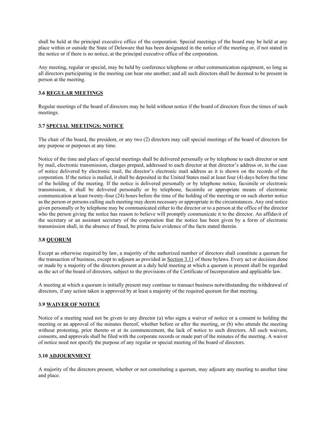 须在法团的主要行政办公室举行。董事会特别会议可在会议通知中指定的特拉华州内外任何地点举行,如通知中未说明或没有通知,则可在公司的主要执行办公室举行。任何会议,无论是定期会议还是特别会议,只要参加会议的所有董事都能听到彼此的声音,就可以用会议电话或其他通讯设备召开;且所有该等董事均视为亲自出席会议。3.6定期会议董事会定期会议由董事会确定召开时间的,可以不发出通知。3.7特别会议;通知董事会主席、总裁或任何两(2)名董事可随时为任何目的或目的召集董事会特别会议。特别会议的时间及地点的通知,须亲自送达或以电话送达每名董事,或以邮件、电子传送、预付费用、寄往每名董事的地址,如以电子邮件送达通知,则须按法团纪录所显示的董事的电子邮件地址送达。邮寄通知的,应至少在会议召开时间的四(4)天前以美国邮寄方式交存。通知亲自送达或以电话通知、传真或电子传送方式送达的,应当在会议召开时间至少二十四(24)小时前亲自送达或以电话、传真或适当的电子通讯方式送达,或者在召开该会议的一人或多人在当时情况下认为必要或适当的较短通知下送达。任何亲自或通过电话发出的口头通知,可以传达给董事,也可以传达给发出通知的人有理由相信会迅速传达给董事的董事办公室的人。法团的秘书或助理秘书的誓章,述明该通知是以电子传送形式发出的,在没有欺诈的情况下,须为其中所述事实的表面证据。3.8法定人数除法律另有规定外,获授权董事人数的过半数应构成业务交易的法定人数,但本附例第3.11条规定的延期除外。出席妥为举行的会议且出席会议达到法定人数的过半数董事作出或作出的每项作为或决定,均应视为董事会的作为,但须遵守《公司注册证书》和适用法律的规定。初步达到法定人数的会议,即使董事退席,仍可继续处理事务,但所采取的任何行动至少获得该次会议所需法定人数的多数批准。3.9放弃通知无须向任何董事(a)签署放弃通知或同意举行会议或批准会议记录,不论是在会议召开之前或之后,或(b)出席会议而无需在会议召开之前或开始时抗议没有向该等董事发出通知。所有这类放弃、同意、批准,应当与法人记录一起备案或者作为会议记录的一部分。豁免通知无须指明任何董事会常会或特别会议的目的。3.10休会出席会议的过半数董事,不论是否构成法定人数,均可将任何会议延期至其他时间和地点。