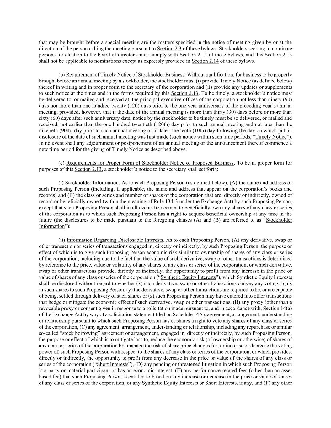 与根据《交易法》第14(a)条为支持提议提交会议的业务而要求进行的代理声明或其他提交文件中披露的与该提议人有关的信息(根据上述(A)至(F)条款将进行的披露称为“可披露权益”);但前提是,可披露权益不应包括与任何经纪人、交易商的正常业务活动有关的任何此类披露,商业银行、信托公司或其他代名人,其仅因是被指示代表实益拥有人编制和提交本章程要求的通知的记录股东而成为提议人;(iii)提议业务的说明。至于股东提议在年会前提出的每一项业务,(a)合理地简要说明希望在年会前提出的业务、在年会上开展此类业务的理由以及每个提议人在此类业务中的任何重大利益,(b)提案或业务的文本(包括提议审议的任何决议的文本),以及(c)合理地详细说明所有协议,任何投标人之间或之间的安排及谅解(x),或任何投标人与任何其他人或实体(包括其姓名)之间或之间的安排及谅解(y),与该股东提出该等业务有关。(四)提案人的定义。就本条第2.13条而言,“提议人”一词系指(i)提供拟在年会前提出的业务通知的股东,(ii)拟在年会前提出的业务通知代表其作出的实益拥有人或实益拥有人(如果不同),以及(iii)该股东或实益拥有人的任何关联公司或联系人(就本附例而言,均为《交易法》第12b-2条规则所指)。(d)更新和补充拟议业务的股东通知。股东如提供拟于周年会议前提出的业务通知,须于有需要时进一步更新及补充该通知,使根据本条第2.13条在该通知中提供或要求提供的资料,自该会议的记录日期起,以及自该会议或其任何休会或延期前十(10)个工作日的日期起,均属真实及正确,而该等更新及补充资料须送达或邮寄及由,在法团各主要行政办事处的秘书不迟于会议记录日期后五(5)个营业日(如须于记录日期作出更新及补充),并在切实可行的情况下不迟于会议日期或会议的任何休会或延期日期前八(8)个营业日(或,如不切实可行,在会议或该等休会或延期举行日期前的第一个实际可行日期)(如需要在会议或其任何休会或延期举行日期前十(10)个工作日作出更新和补充,视情况而定)。(e)未在会议前适当提出的业务。尽管本附例另有相反规定,除非按照本条第2.13条,否则不得在周年会议上进行任何业务。除法律、法团的法团注册证书或本附例另有规定外,会议主席如有事实根据,须裁定并宣布(i)该业务没有按照本条第2.13条订明的程序适当地提交会议,(ii)该业务没有资格在会议上审议,或(iii)提议人违反其或其根据或依据本条第2.13条作出的陈述、承诺、协议或义务,而在每宗该等情况下,会议主席须在会议上如此声明,即使法团可能已接获有关该业务的代理人,该业务仍不予理会。会议主席的任何决定均为结论性决定,并对公司所有股东出于任何目的具有约束力。(f)细则14a-8;《交易法》的遵守情况。除根据《交易法》第14a-8条提出的任何提案外,本第2.13条明确打算适用于拟提交股东年会的任何业务。除本条第2.13款关于拟提交年会的任何事务的规定外, 每个投标人应遵守《交易法》关于任何此类业务的所有适用要求。根据《交易法》第14a-8条,本节2.13中的任何内容均不得被视为影响股东根据规则14a-8要求将提案纳入公司代理声明的权利。