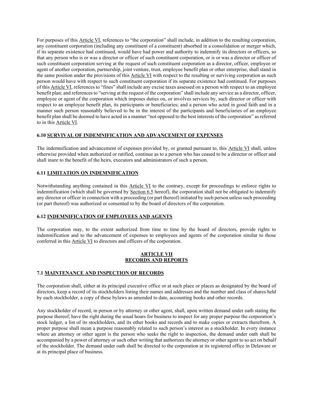 为本条第六条的目的,凡提述“法团”,除产生的法团外,还应包括在合并或合并中被吸收的任何组成法团(包括任何组成部分的任何组成部分),如果其单独存在继续存在,本应有权和授权对其董事或高级职员进行赔偿,从而使任何现在或曾经是该组成法团的董事或高级职员的人,或现在或曾经是该组成法团的董事或高级职员,应该组成法团的要求担任另一法团、合伙企业的董事、高级职员、雇员或代理人,合营企业、信托、雇员福利计划或其他企业,就产生的或存续的法团而言,应与该人在该组成法团单独存续的情况下对该组成法团所具有的地位在本条第六条的规定下处于同一地位。就本第六条而言,提及“罚款”应包括就雇员福利计划向某人课税的任何消费税;而提及“应公司要求服务”应包括作为公司的董事、高级职员、雇员或代理人而对该董事或高级职员就雇员福利计划施加职责或涉及其服务的任何服务,其参与者或受益人;以及以合理认为符合雇员福利计划参与者和受益人利益的善意和方式行事的人,应被视为以本条第六条所述“不违背公司最佳利益”的方式行事。6.10赔偿和垫付费用的存续由第六条提供或依据第六条授予的赔偿和垫付费用,除经授权或批准时另有规定外,应继续适用于已不再担任董事或高级管理人员的人,并应符合该人的继承人、遗嘱执行人和管理人的利益。6.11对赔偿的限制尽管本条第六条有相反的规定,但除强制执行赔偿权利的程序(受本条例第6.5条管辖)外,公司没有义务就该人提起的程序(或其部分)向任何董事或高级人员作出赔偿,除非该程序(或其部分)获公司董事会授权或同意。6.12对雇员和代理人的赔偿公司可以在董事会不时授权的范围内,向公司的雇员和代理人提供类似于本条第六条授予公司的董事和高级职员的赔偿和预支费用的权利。第七条记录和报告7.1保存和检查记录法团应在其主要执行办公室或董事会指定的一个或多个地点保存其股东的记录,列出其姓名和地址以及每个股东持有的股份数量和类别、经修订的本章程副本、会计账簿和其他记录。任何登记在册的股东,无论是亲自或由律师或其他代理人,在经宣誓陈述其目的的书面要求下,均有权在正常营业时间内为任何适当目的查阅法团的股票分类账、其股东名单及其其他簿册和记录,并制作副本或从中摘录。适当目的是指与该人作为股东的利益合理相关的目的。律师或其他代理人是寻求查验权的人的每一种情形,经宣誓的要求应附有授权书或授权该律师或其他代理人代表股东如此行事的其他书面形式。经宣誓的要求应在公司在特拉华州的注册办事处或其主要营业地点向公司提出。