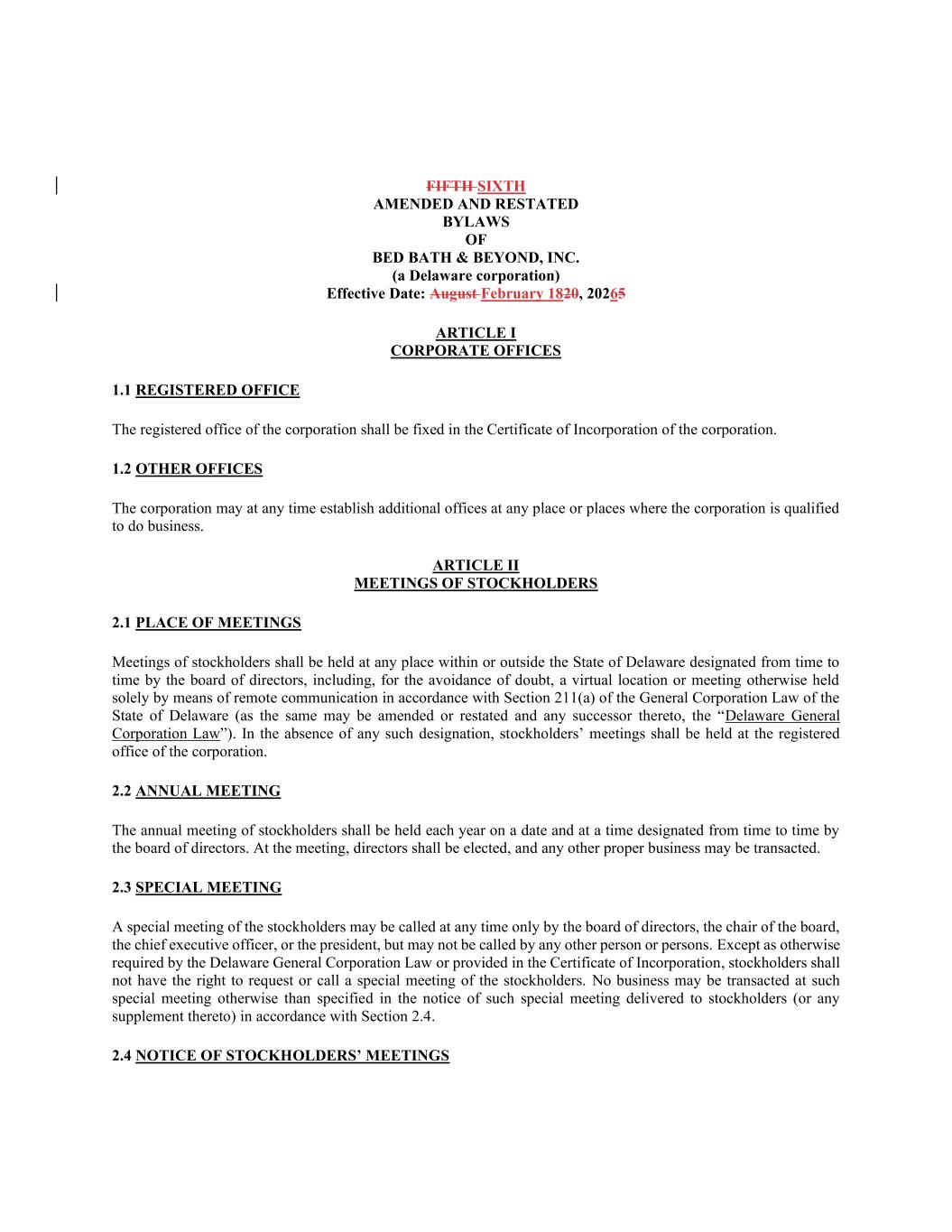 BED BATH & BEYOND,INC.(一家特拉华州公司)第五届第六次修订和重述的章程生效日期:20265年8月2月18日第I条公司办公室1.1注册办事处公司的注册办事处应在公司的注册证书中确定。1.2其他办事处法团可随时在法团有资格经营业务的任何地方增设办事处。第二条股东大会2.1会议地点股东大会应在董事会不时指定的特拉华州境内或境外的任何地点举行,包括为免生疑问,根据《特拉华州一般公司法》第211(a)条(同样可修订或重述,其任何继承者为《特拉华州一般公司法》)仅以远程通讯方式举行的虚拟地点或会议。在没有任何此种指定的情况下,股东大会应在公司的注册办事处举行。2.2年度会议年度股东大会应当每年在董事会不定期指定的日期和时间召开。会议应选举董事,并可办理任何其他适当事务。2.3特别会议股东特别会议在任何时候只能由董事会、董事会主席、首席执行官或总裁召集,但不得由任何其他人召集。除特拉华州一般公司法另有规定或公司注册证书另有规定外,股东无权要求或召集股东特别会议。除根据第2.4条送达股东的特别会议通知(或其任何补充)所指明外,不得在该特别会议上处理任何事务。2.4股东会议通知