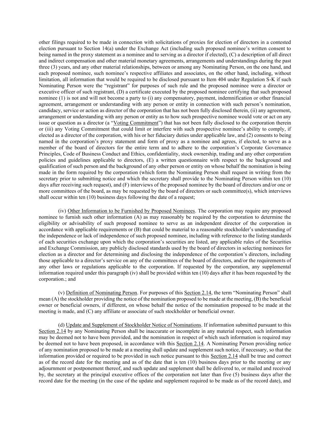 不迟于会议举行日期前八(8)个工作日(如切实可行,或如不可行,则在会议举行日期前的第一个实际可行日期或该日期的休会或延期)(如须于会议举行前十(10)个工作日或其任何休会或延期(如适用)作出更新和补充)。为免生疑问,依据本(d)款提供的任何资料,不应被视为纠正先前交付的通知中的任何缺陷,也不应延长交付该通知的期限。经秘书代表董事会(或其获正式授权的委员会)提出书面要求,任何该等提名人须在该要求送达后七(7)个营业日内(或该要求所指明的其他期间),(a)提供董事会合理信纳的书面核实,为该目的而获授权的董事会任何委员会或法团任何获授权人员,以证明该提名人根据本条第2.14条提交的任何资料的准确性,以及(b)对该提名人在较早日期根据本条第2.14条提交的任何资料的书面确认。如果提名者未能在该期限内提供此类书面核实或确认,则可根据本条2.14视为未提供关于请求书面核实或确认的信息。(e)细则14a-19。如果(a)任何提名者根据《交易法》第14a-19(b)条提供通知,并且(b)该提名者随后(x)通知公司,该提名者不再打算根据《交易法》第14a-19条规则征集支持公司被提名人以外的董事被提名人的代理人,或者(y)未能遵守《交易法》第14a-19(a)(2)条或第14(a)(3)条的要求,则公司应不考虑为该提名者提出的被提名人征集的任何代理人或投票。经公司要求,如任何提名者根据《交易法》第14a-19(b)条规则提供通知,该提名者应不迟于适用的会议日期前五(5)个工作日向秘书提供合理证据,证明《交易法》第14a-19(a)(3)条规则的要求已得到满足。(f)有缺陷的提名。尽管本附例另有相反规定,除非按照本条第2.14条获提名,否则任何人均无资格获选为法团董事。除法律、法团的法团注册证书或本附例另有规定外,会议主席如有事实根据,须裁定并宣布(i)提名并非按照本条第2.14条订明的程序作出,(ii)建议的代名人没有资格根据本条第2.14条在法团的代理材料中被提名或在会议上被考虑选举,或(iii)建议的代名人和/或适用的提名人已违反其陈述、承诺,根据或依据本条第2.14条订立的协议或承担的义务,而在每宗该等情况下,会议主席须在会议上如此宣布,即使有关建议代名人的提名的代理人可能已由法团接获,该提名亦应不予考虑。会议主席的任何决定均为结论性决定,并对公司所有股东出于任何目的具有约束力。(g)遵守国家法律和交易法。除本第2.14节关于拟在会议上提出的任何提名的要求外,每个提名者应遵守州法律和《交易法》关于任何此类提名的所有适用要求。(h)提名人数。股东在某次会议上可提名选举的被提名人人数不得超过该次会议上应选出的董事人数,为免生疑问,任何股东均无权在本条第2.14款规定的期限届满后提出额外或替代提名。尽管本条第2.14条另有相反规定, 如在年度会议上获选进入董事会的董事人数多于在该年度会议日期任期届满的董事人数,且法团并无公开披露在紧接前一次股东周年会议周年日前第七十(70)天营业时间结束前指明在该会议上获选的增加的董事人数,亦须认为及时发出通知,但仅就因待选董事人数增加而产生的任何新董事职位的提名人选而言,如该提名须不迟于公司首次作出公开披露指明待选董事人数的翌日第十(10)日的营业时间结束时在公司主要行政办公室交付予秘书。