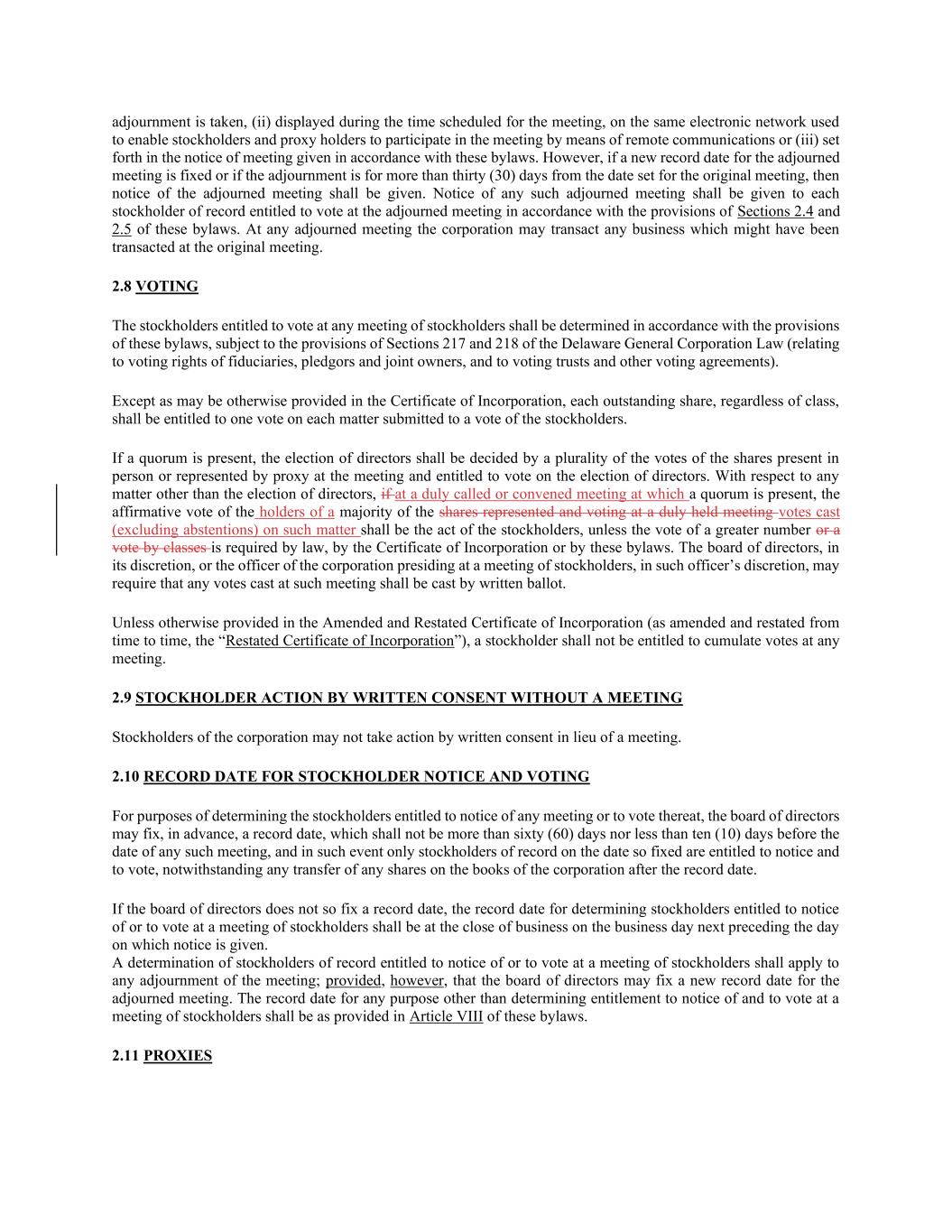 采取休会,(ii)在会议预定时间内显示在用于使股东和代理持有人能够通过远程通信方式参加会议的同一电子网络上,或(iii)在根据本章程发出的会议通知中列出。但是,如果为续会确定了新的记录日期,或者如果续会自为原会议确定的日期起超过三十(30)天,则应发出续会通知。任何该等续会的通知,须根据本附例第2.4及2.5条的规定,给予每名有权在续会上投票的记录股东。在任何续会上,法团可处理在原会议上可能已处理的任何事务。2.8投票有权在任何股东大会上投票的股东应根据本章程的规定确定,但须遵守《特拉华州一般公司法》第217和218条的规定(涉及受托人、出质人和共同所有人的投票权,以及投票信托和其他投票协议)。除公司注册证书另有规定外,每一股流通股,无论类别如何,均有权就提交股东表决的每一事项投一票。如出席会议的人数达到法定人数,则董事的选举应由亲自出席会议或由代理人代表出席会议并有权就董事选举投票的股份的多数票决定。就选举董事以外的任何事项而言,如在出席法定人数的适当召集或召开的会议上,代表并在适当举行的会议上投票的过半数股份持有人对该事项投的赞成票(不包括弃权票)应为股东的行为,但法律、公司注册证书或本附例要求更大数目的投票或按类别投票的除外。董事会或主持股东大会的法团高级人员可酌情规定,在该会议上所投的任何票均须以书面投票方式投出。除非经修订和重述的公司注册证书(经不时修订和重述,“重述的公司注册证书”)另有规定,否则股东无权在任何会议上累积投票。2.9股东在未举行会议的情况下以书面同意采取行动公司股东不得以书面同意代替会议采取行动。2.10股东通知和投票的记录日期为确定有权获得任何会议通知或在该会议上投票的股东,董事会可提前确定一个记录日期,该日期不得超过任何该等会议日期的六十(60)天或不少于十(10)天,在此情况下,只有在如此确定的日期登记在册的股东才有权获得通知和投票,尽管在记录日期之后公司账簿上的任何股份有任何转让。董事会未如此确定记录日期的,确定有权获得股东大会通知或在股东大会上投票的股东的记录日期应为发出通知之日前一个营业日的营业时间结束时。有权获得股东大会通知或在股东大会上投票的记录股东的决定应适用于会议的任何休会;但董事会可为休会会议确定新的记录日期。除确定获得股东大会通知和在股东大会上投票的权利以外的任何目的的记录日期应按本章程第八条的规定。2.11代理