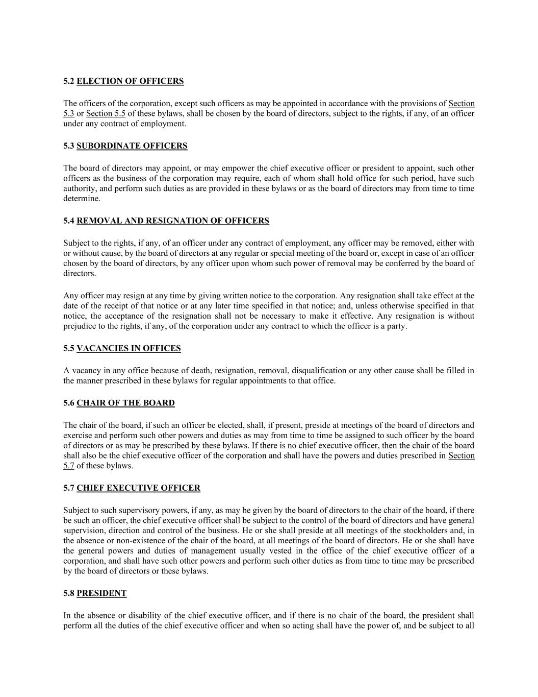 5.2选举高级人员法团的高级人员,除根据本附例第5.3条或第5.5条的条文委任的高级人员外,须由董事会选出,但须受任何高级人员根据任何雇用合约所享有的权利(如有的话)规限。5.3附属人员董事会可委任或授权行政总裁或总裁委任法团业务所需的其他人员,每名人员的任期、权力及履行本附例所规定或董事会不时决定的职责。5.4除任何人员根据任何雇用合约所享有的权利(如有的话)外,任何人员均可由董事会在董事会的任何定期会议或特别会议上,或(如属董事会选出的人员除外)由董事会可授予该等撤职权力的任何人员,在有或无因由的情况下,将其撤职。任何高级人员可随时向法团发出书面通知而辞职。任何辞呈须于收到该通知之日或该通知指明的任何较后时间生效;而除非该通知另有指明,否则无须接纳该辞呈以使其生效。任何辞职均不损害该高级人员作为当事人的任何合同项下的法团的任何权利(如有的话)。5.5职位空缺任何职位因死亡、辞职、免职、取消资格或任何其他原因而出现的空缺,须按本附例就该职位的定期委任订明的方式填补。5.6董事会主席董事会主席如获选出该等高级人员,须出席董事会会议,并行使及执行董事会不时委予该等高级人员或本附例订明的其他权力及职责。如没有行政总裁,则董事会主席亦为法团行政总裁,并具有本附例第5.7条订明的权力及职责。5.7行政总裁须受董事会赋予董事会主席的监督权力(如有的话)规限,如有该等人员,则行政总裁须受董事会控制,并对业务有一般监督、指示及控制。他或她应主持股东的所有会议,并在董事会主席不在或不存在时,主持董事会的所有会议。他或她拥有通常归属于法团行政总裁职位的一般管理权力及职责,并拥有董事会或本附例不时订明的其他权力及执行其他职责。5.8总裁在首席执行官缺席或残疾时,如果没有董事会主席,则总裁应履行首席执行官的所有职责,并在这样做时拥有权力,并受制于所有