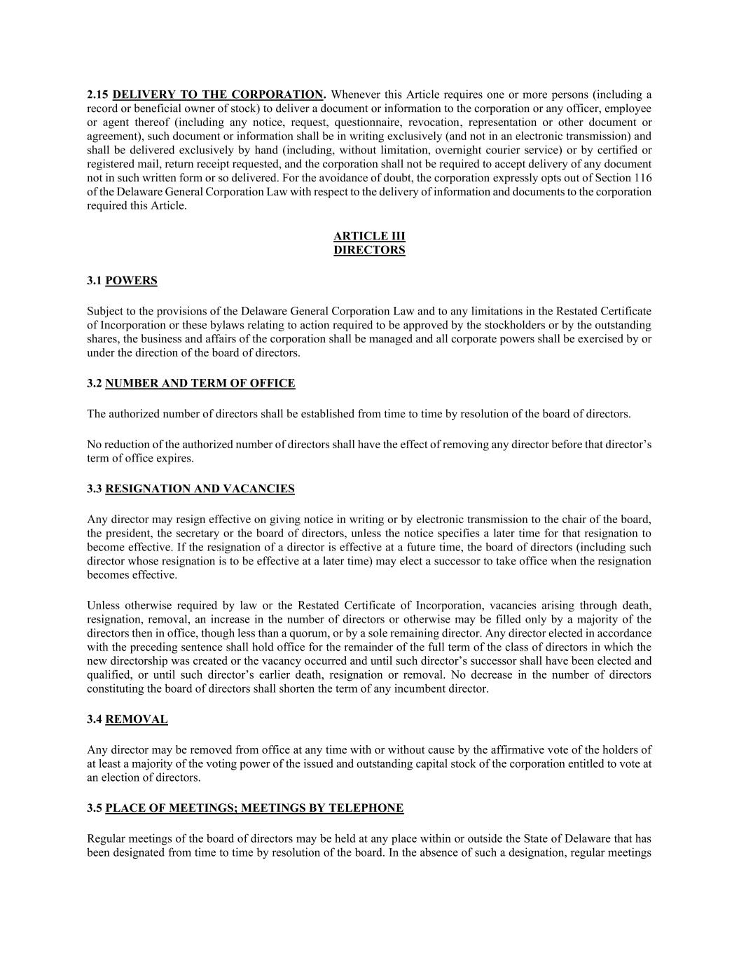 2.15交付给公司。凡本条规定一名或多于一名人士(包括股票的纪录或实益拥有人)向法团或其任何高级人员、雇员或代理人交付文件或资料(包括任何通知、要求、调查问卷、撤销、陈述或其他文件或协议),该等文件或资料应仅以书面形式(而非以电子传送形式),并应仅以专人送达(包括但不限于隔夜快递服务)或以挂号信、要求回执的方式交付,而法团无须接受非以该书面形式或如此交付的任何文件的交付。为免生疑问,公司明确选择退出《特拉华州一般公司法》关于向公司交付信息和文件需要本条的第116条。第三条董事3.1权力根据《特拉华州一般公司法》的规定以及重述的公司注册证书或本章程中与股东或已发行股份所需批准的行动有关的任何限制,公司的业务和事务应得到管理,所有公司权力应由董事会或在董事会的指示下行使。3.2任职人数和任期授权董事人数应不时由董事会决议设立。不得减少授权董事人数,在该董事任期届满前具有罢免该董事的效力。3.3辞职和空缺任何董事均可在向董事会主席、总裁、秘书或董事会发出书面或电子传送通知后辞职生效,除非通知指明该辞职生效的较后时间。董事的辞职在未来时间生效的,董事会(包括其辞职将在以后时间生效的董事)可以在辞职生效时选举继任者就任。除非法律或重述的公司注册证书另有规定,因死亡、辞职、免职、董事人数增加或其他原因而产生的空缺,只能由当时在任的董事过半数填补,但低于法定人数,或由一名唯一的留任董事填补。依照前一句选出的任何董事,任期至产生新的董事职位或出现空缺的董事类别的全部任期的剩余时间,并直至该董事的继任者已当选并符合资格,或直至该董事较早前去世、辞职或被免职为止。组成董事会的董事人数不减少,任何在任董事的任期不得缩短。3.4罢免任何董事可随时在有理由或无理由的情况下,由有权在董事选举中投票的公司已发行和流通股本的至少过半数表决权的持有人投赞成票而被免职。3.5会议地点;以电话方式举行会议董事会定期会议可在特拉华州内外经董事会决议不时指定的任何地点举行。在没有这种指定的情况下,定期会议