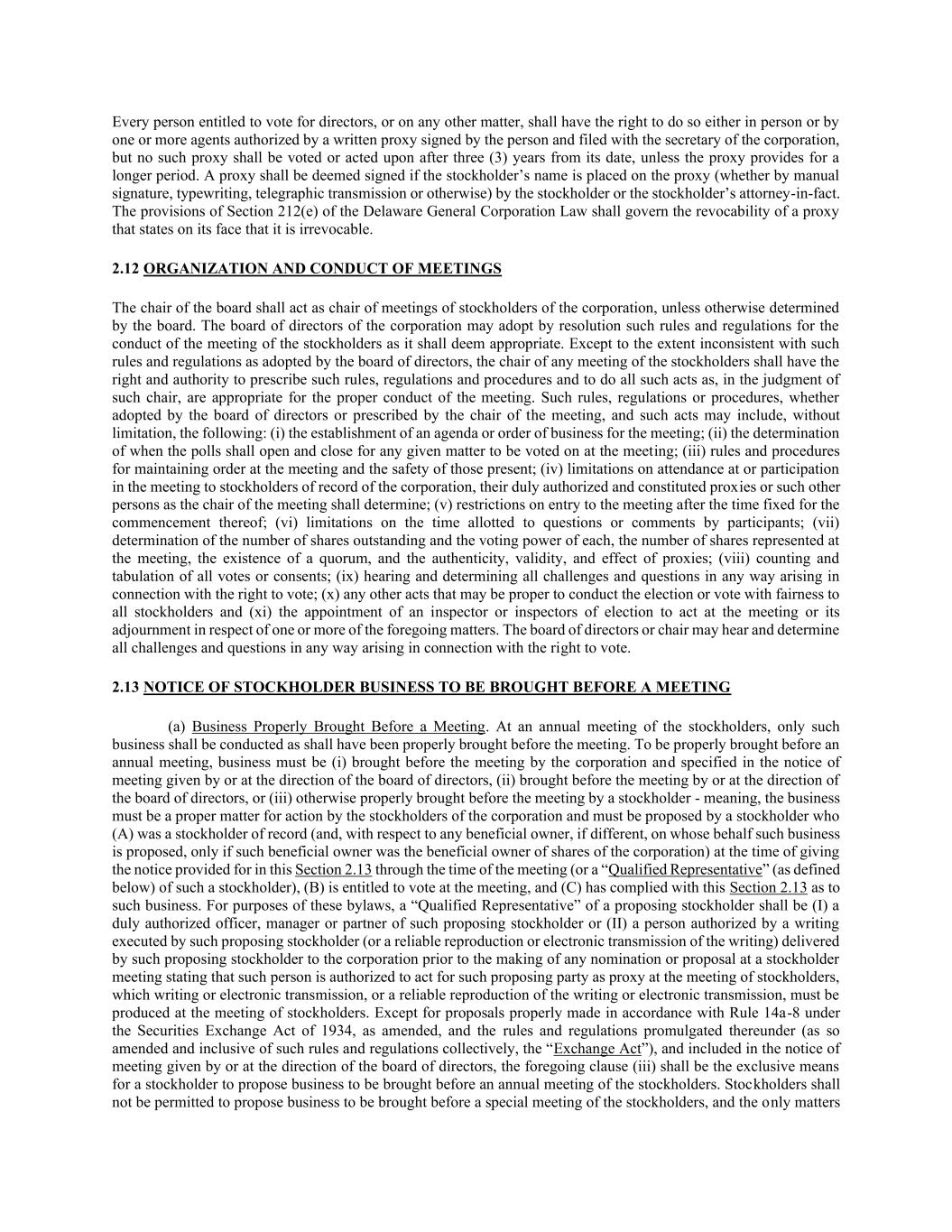 每名有权投票选举董事的人,或就任何其他事项投票的人,均有权亲自或由一名或多于一名获该人签署并向法团秘书备案的书面代表授权的代理人这样做,但自该日期起计三(3)年后,不得对该等代表进行投票或采取行动,除非该代表规定了更长的期限。股东或股东的实际代理人将股东的姓名(无论是通过人工签字、打字、电传或其他方式)放在代理人上的,视为签名。特拉华州一般公司法第212(e)节的规定应管辖表面上声明不可撤销的代理的可撤销性。2.12会议的组织和召开董事会主席应担任公司股东会议的主席,除非董事会另有决定。法团董事会可以决议通过其认为适当的股东大会议事规则和规章。除与董事会通过的规则和条例不一致的情况外,股东大会的任何会议的主席均有权利和权力规定该等规则、条例和程序,并作出该主席认为对会议的适当进行适当的一切行为。该等规则、规例或程序,不论是否由董事会通过或由会议主席订明,而该等作为可包括但不限于以下内容:(i)为会议订立议程或业务顺序;(ii)确定投票何时开启和结束,以便在会议上就任何特定事项进行表决;(iii)维持会议秩序和出席者安全的规则和程序;(iv)对出席或参加会议的法团记录股东的限制,其正式授权和组成的代理人或会议主席应确定的其他人;(v)在规定的开始时间之后限制进入会议;(vi)对分配给与会者提问或评论的时间的限制;(vii)确定各自的已发行股份数量和投票权、出席会议的股份数量、是否存在法定人数以及真实性、有效性,及代理人的效力;(viii)对所有投票或同意进行计票和制表;(ix)以任何方式听取和确定与投票权有关的所有质疑和问题;(x)为公平地进行选举或对所有股东进行投票而可能适当的任何其他行为,以及(xi)就上述一项或多项事项任命一名或多名选举检查员在会议或会议休会时行事。董事会或主席可以以任何方式听取和决定与投票权有关的所有挑战和问题。2.13在会议前提出的股东业务通知(a)在会议前适当提出的业务。在股东年会上,只应进行已妥为提交会议的业务。如要适当地将业务提交周年会议,业务必须(i)由法团提交会议,并在由董事会发出或应董事会指示而发出的会议通知中指明,(ii)由董事会或应董事会指示而提交会议,或(iii)以其他方式由股东适当地提交会议-意思是,该业务必须是供法团股东采取行动的适当事项,且必须由(a)为记录在案股东的股东提出(及,就代表其提出该业务的任何实益拥有人(如不同)而言,只有当该实益拥有人在发出本条第2.13条所规定的通知时(或该股东的“合格代表”(定义见下文))是公司股份的实益拥有人时,(b)才有权在该会议上投票,而(c)已就该业务遵守本条第2.13条。就本附例而言,建议股东的“合格代表”须为(i)该建议股东的正式授权人员、经理或合伙人,或(ii)获该建议股东签立的书面授权的人(或该书面授权的可靠复制品或电子传送),该书面授权由该建议股东在股东大会上作出任何提名或建议之前交付予法团,述明该人获授权在股东大会上作为代表该建议方行事,该书面或电子传送, 或书面或电子传输的可靠复制品,必须在股东大会上出示。除根据经修订的《1934年证券交易法》第14a-8条和根据其颁布的规则和条例(经如此修订并包括此类规则和条例统称为“交易法”)适当提出的提案外,并包括在由董事会发出或在董事会指示下发出的会议通知中,上述第(iii)条应是股东向股东年度会议提出业务提案的唯一方式。不得允许股东向股东特别会议提出业务、唯一事项