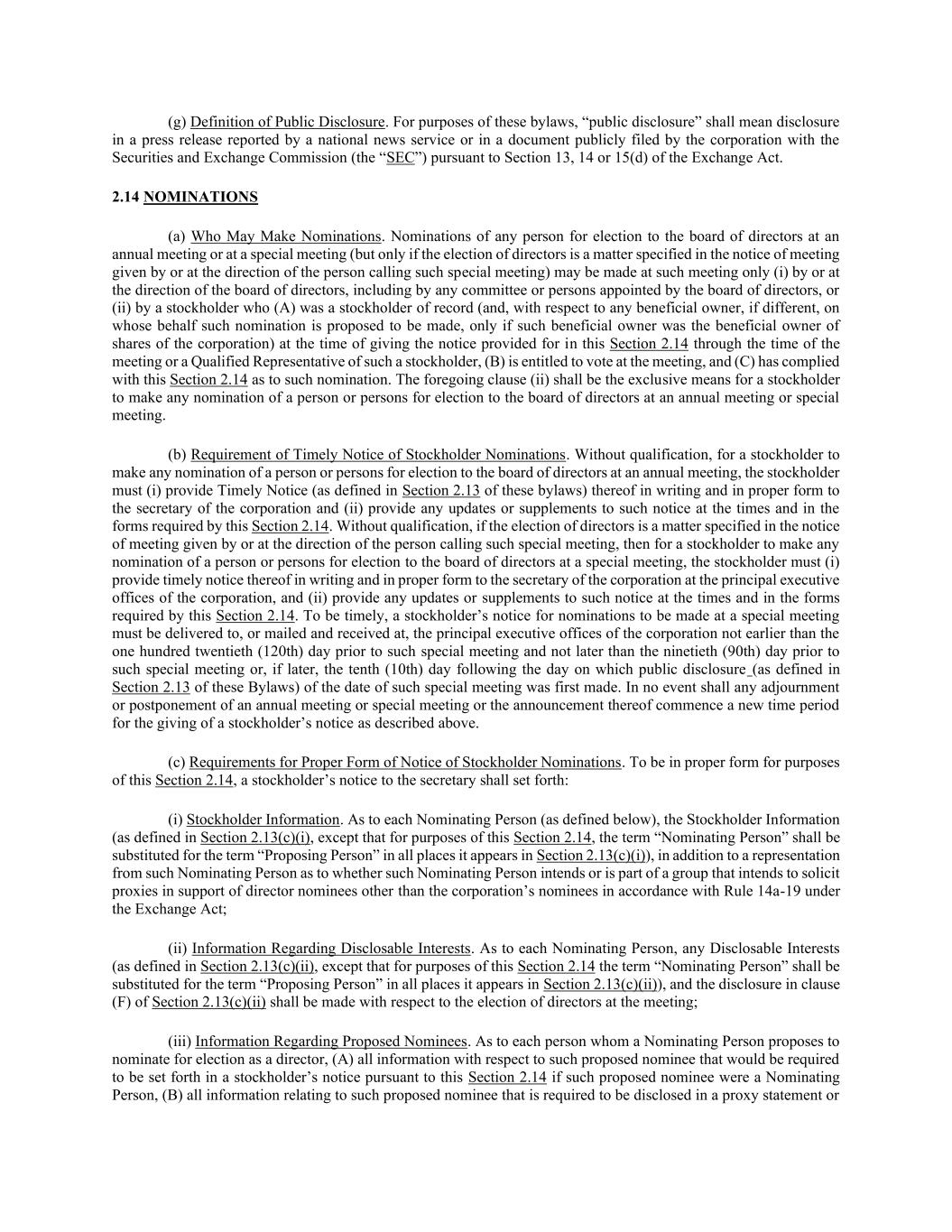 (g)公开披露的定义。就本章程而言,“公开披露”是指在国家新闻服务机构报道的新闻稿中或公司根据《交易法》第13、14或15(d)条向美国证券交易委员会(“SEC”)公开提交的文件中的披露。2.14提名人(a)可作出提名的人。在年会或特别会议上提名任何人士参选董事会成员(但仅限于选举董事是由召开该特别会议的人发出或在其指示下发出的会议通知中指明的事项),只能在该会议上(i)由董事会或在董事会的指示下作出,包括由董事会委任的任何委员会或人士作出,或(ii)由(a)为纪录股东的股东(而就任何实益拥有人而言,如不同,建议代其作出该等提名,惟须该等实益拥有人在发出本条第2.14条所规定的通知时直至该会议召开时为止是法团股份的实益拥有人)或该股东的合格代表,(b)有权在该会议上投票,而(c)已就该等提名遵从本条第2.14条。前述第(ii)款为股东在年会或特别会议上作出任何提名以供选举进入董事会的人士的专属方式。(b)要求及时通知股东提名。在没有资格的情况下,股东如要在周年会议上作出任何提名一人或多人参选董事会成员,股东必须(i)以书面及适当形式及时向法团秘书提供有关通知(定义见本附例第2.13条),及(ii)在时间上及以本条第2.14条规定的格式提供对该通知的任何更新或补充。在没有保留的情况下,如董事的选举是由召开该特别会议的人发出或在其指示下发出的会议通知中指明的事项,则股东如要在特别会议上作出任何提名一人或多人参加董事会选举,该股东必须(i)在公司的主要行政办公室及时以书面及适当形式向公司秘书提供该通知,及(ii)按本条第2.14条所规定的时间及表格,提供该等通知的任何更新或补充。为及时起见,股东在特别会议上作出提名的通知,必须不早于该特别会议举行前一百二十(120)天,且不迟于该特别会议举行前的第九十(90)天,或如较迟,则须于首次作出该特别会议日期的公开披露(定义见本附例第2.13条)之日的翌日第十(10)天,送达或邮寄并于法团主要执行办公室收悉。在任何情况下,年度会议或特别会议的任何休会或延期或其公告均不得开始发出上述股东通知的新时间段。(c)对适当形式的股东提名通知的要求。为施行本条第2.14条的适当形式,股东向秘书发出的通知应载列:(i)股东资料。至于每名提名者(定义见下文),股东信息(定义见第2.13(c)(i)节,但就本第2.14节而言,“提名者”一词应在第2.13(c)(i)节中出现的所有地方取代“提名者”一词),此外,该提名者还表示,该提名者是否打算或属于打算根据《交易法》第14a-19条规则征集代理人以支持公司被提名人以外的董事被提名人的集团;(ii)有关可披露权益的信息。就每名提名人士而言,任何须予披露的权益(定义见第2.13(c)(ii)条,但就本第2.14条而言,须在第2.13(c)(ii)条出现的所有地方以「提名人士」一词取代「提议人」一词),而第2.13(c)(ii)条(f)条中的披露须就会议上的董事选举作出;(iii)有关建议提名人的资料。至于每名提名者建议提名参选董事的人,(a)如该等建议提名人是提名者,则须根据本条第2.14条在股东通知中载列的有关该等建议提名人的所有资料, (b)与该等建议代名人有关的所有须在代理声明或