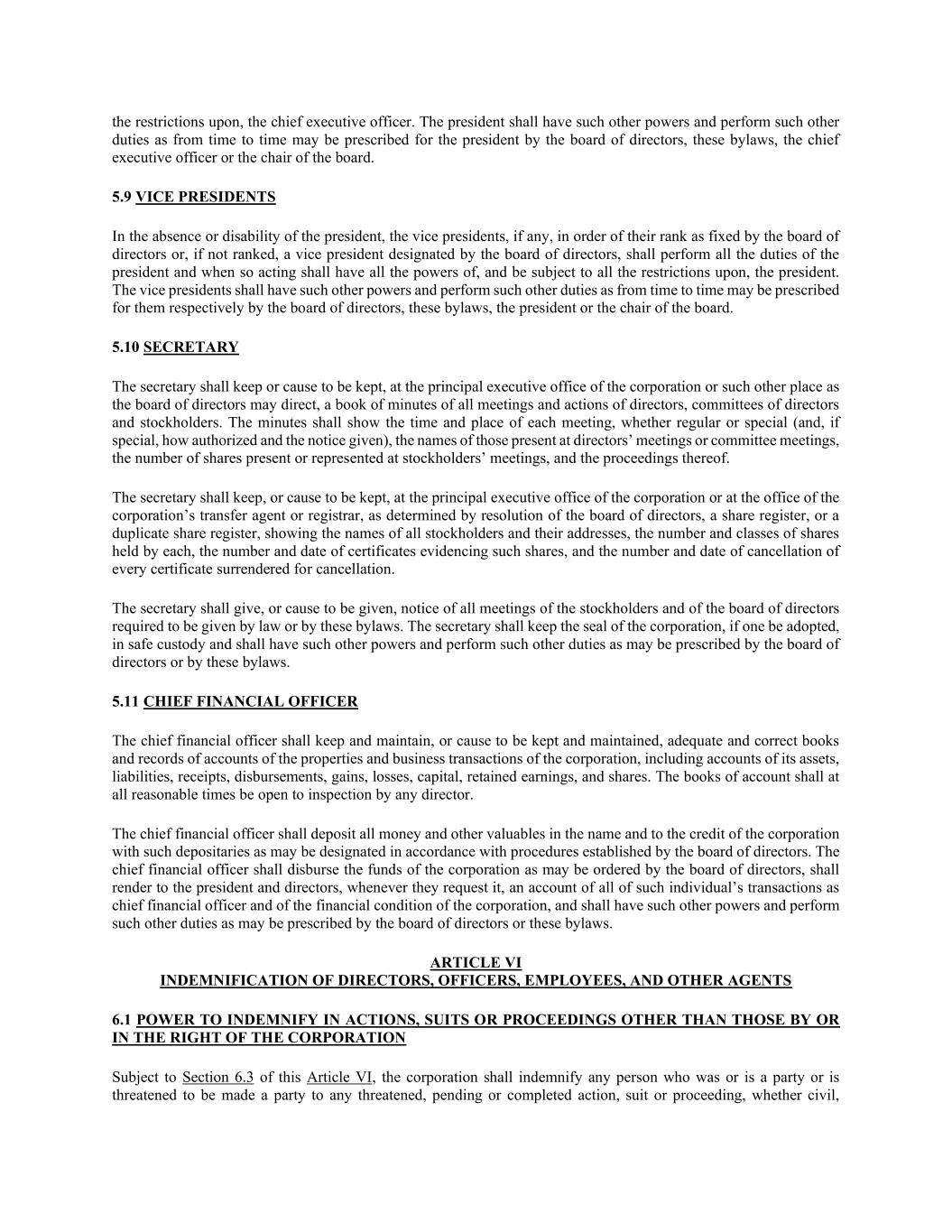 的限制,首席执行官。总裁拥有董事会、本章程、行政总裁或董事会主席不时为总裁订明的其他权力及执行其他职责。5.9副总裁在总裁缺席或残疾的情况下,由副总裁(如有)按董事会确定的职级排列,如无职级排列,则由董事会指定的副总裁(如无职级排列),履行总裁的所有职责,并在这样行事时拥有总裁的所有权力,并受到对总裁的所有限制。副行长具有董事会、本章程、行长或董事长分别为其规定的其他权力和履行的其他职责。5.10秘书秘书须在法团的主要执行办公室或董事会指示的其他地方备存或安排备存董事、董事委员会及股东的所有会议及行动的会议记录簿。会议记录应显示每次会议的时间和地点,无论是定期会议还是特别会议(如特殊,还包括如何授权和发出的通知)、出席董事会议或委员会会议的人员的姓名、出席或代表出席股东大会的股份数量及其议事情况。秘书须备存或安排备存于经董事会决议厘定的法团主要执行办公室或法团的转让代理人或登记处的办公室、股份登记册或股份登记册副本,并须显示所有股东的姓名及其地址、各自持有的股份数目及类别、证明该等股份的证明书的数目及日期,以及每份交还注销的证明书的数目及注销日期。秘书须发出或安排发出法律或本附例规定须举行的所有股东大会及董事会会议的通知。秘书须将法团的印章(如有印章获采纳)妥善保管,并具有董事会或本附例所订明的其他权力及执行其他职责。5.11首席财务官首席财务官应备存或促使备存和保持充分和正确的账簿和记录公司的财产和业务交易,包括其资产、负债、收入、支出、收益、损失、资本、留存收益和股份的账目。账簿须于所有合理时间开放供任何董事查阅。财务总监须将所有金钱及其他贵重物品以法团名义存放于按董事会订立的程序指定的存管机构,并存入法团的信贷。财务总监须按董事会的命令拨付法团的资金,并须在总裁及董事提出要求时,向其提供有关作为财务总监的个人的所有交易及法团财务状况的帐目,并具有董事会或本附例订明的其他权力及执行其他职责。第六条董事、高级管理人员、雇员和其他代理人的赔偿6.1公司在符合本条第六条第6.3节的规定的情况下,在公司或公司有权采取的行动、诉讼或程序以外的行动、诉讼或程序中进行赔偿的权力,公司应赔偿曾是或现在是或被威胁成为任何威胁、待决或已完成的行动、诉讼或程序的一方的任何人,不论是否民事,