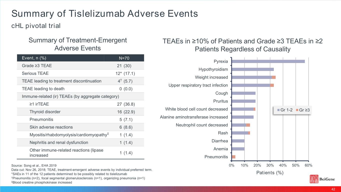 Summary of Tislelizumab Adverse Events cHL pivotal trial Summary of Treatment-Emergent TEAEs in ≥10% of Patients and Grade ≥3 TEAEs in ≥2 Adverse Events Patients Regardless of Causality Event, n (%) N=70 Pyrexia Grade ≥3 TEAE 21 (30) Hypothyroidism Serious TEAE 12* (17.1) Weight increased TEAE leading to treatment discontinuation 4† (5.7) Upper respiratory tract infection TEAE leading to death 0 (0.0) Cough Immune-related (ir) TEAEs (by aggregate category) Pruritus ≥1 irTEAE 27 (36.8) White blood cell count decreased Thyroid disorder 16 (22.9) Gr 1-2 Gr ≥3 Alanine aminotransferase increased Pneumonitis 5 (7.1) Neutrophil count decreased Skin adverse reactions 6 (8.6) Myositis/rhabdomyolysis/cardiomyopathy‡ 1 (1.4) Rash Nephritis and renal dysfunction 1 (1.4) Diarrhea Other immune-related reactions (lipase Anemia 1 (1.4) increased Pneumonitis Source: Song et al., EHA 2019 0% 10% 20% 30% 40% 50% 60% Data cut: Nov 26, 2018; TEAE, treatment-emergent adverse events by individual preferred term. *SAEs in 11 of the 12 patients determined to be possibly related to tislelizumab Patients (%) †Pneumonitis (n=2), focal segmental glomerulosclerosis (n=1), organizing pneumonia (n=1) ‡Blood creatine phosphokinase increased 42