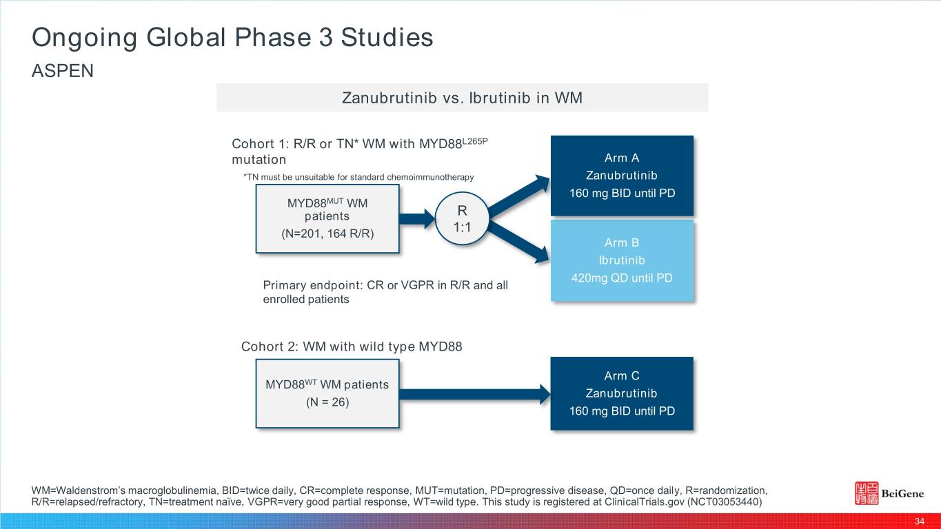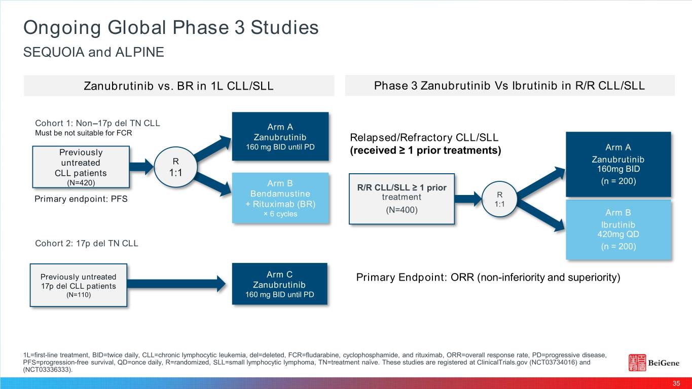 Ongoing Global Phase 3 Studies ASPEN Zanubrutinib vs. Ibrutinib in WM Cohort 1: R/R or TN* WM with MYD88L265P mutation Arm A *TN must be unsuitable for standard chemoimmunotherapy Zanubrutinib 160 mg BID until PD MYD88MUT WM patients R (N=201, 164 R/R) 1:1 Arm B Ibrutinib 420mg QD until PD Primary endpoint: CR or VGPR in R/R and all enrolled patients Cohort 2: WM with wild type MYD88 Arm C MYD88WT WM patients Zanubrutinib (N = 26) 160 mg BID until PD WM=Waldenstrom’s macroglobulinemia, BID=twice daily, CR=complete response, MUT=mutation, PD=progressive disease, QD=once daily, R=randomization, R/R=relapsed/refractory, TN=treatment naïve, VGPR=very good partial response, WT=wild type. This study is registered at ClinicalTrials.gov (NCT03053440) 34