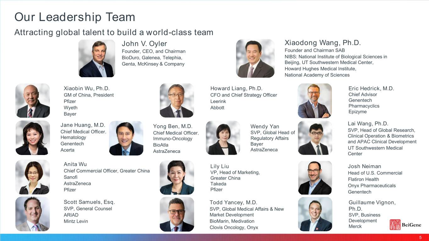Our Strategies -- Building a Leading Global Innovative Biotech Company From China With the utmost commitment to patients, quality, and science Realize two large near-term commercial opportunities • Global opportunity for potentially best-in-class BTK inhibitor zanubrutinib • Opportunity for differentiated anti-PD-1 antibody tislelizumab in China and beyond Strengthen key strategic capabilities • Global clinical development • Commercial platform Capture opportunities created by regulatory reforms in China • Accelerate global development through China-inclusive global trials • Continue to expand our portfolio by leveraging our strong clinical capabilities Pursue a new global model for growth by leveraging China’s reimbursement expansion • Expanded commercial base in China lowers per-patient R&D investment and allows greater access • Uniquely positioned due to strong China presence and global development 4