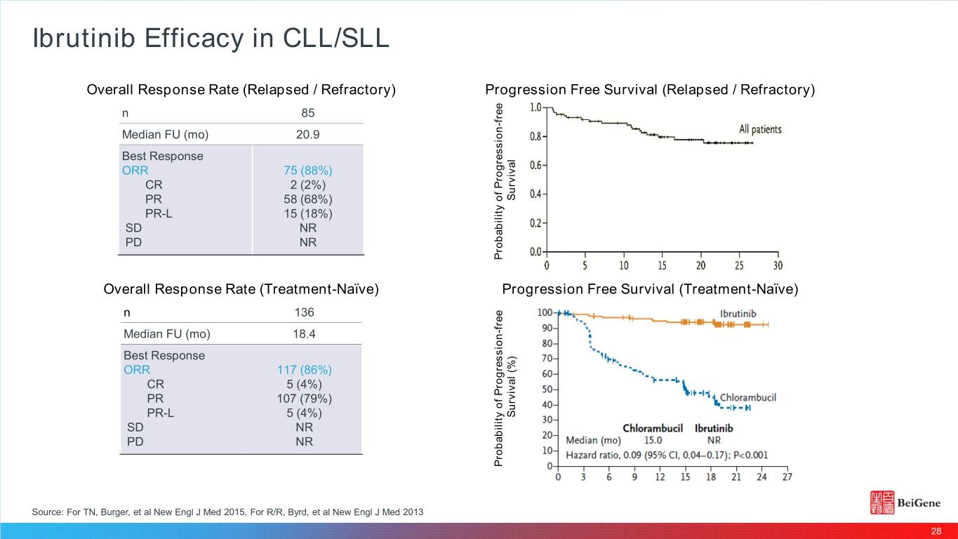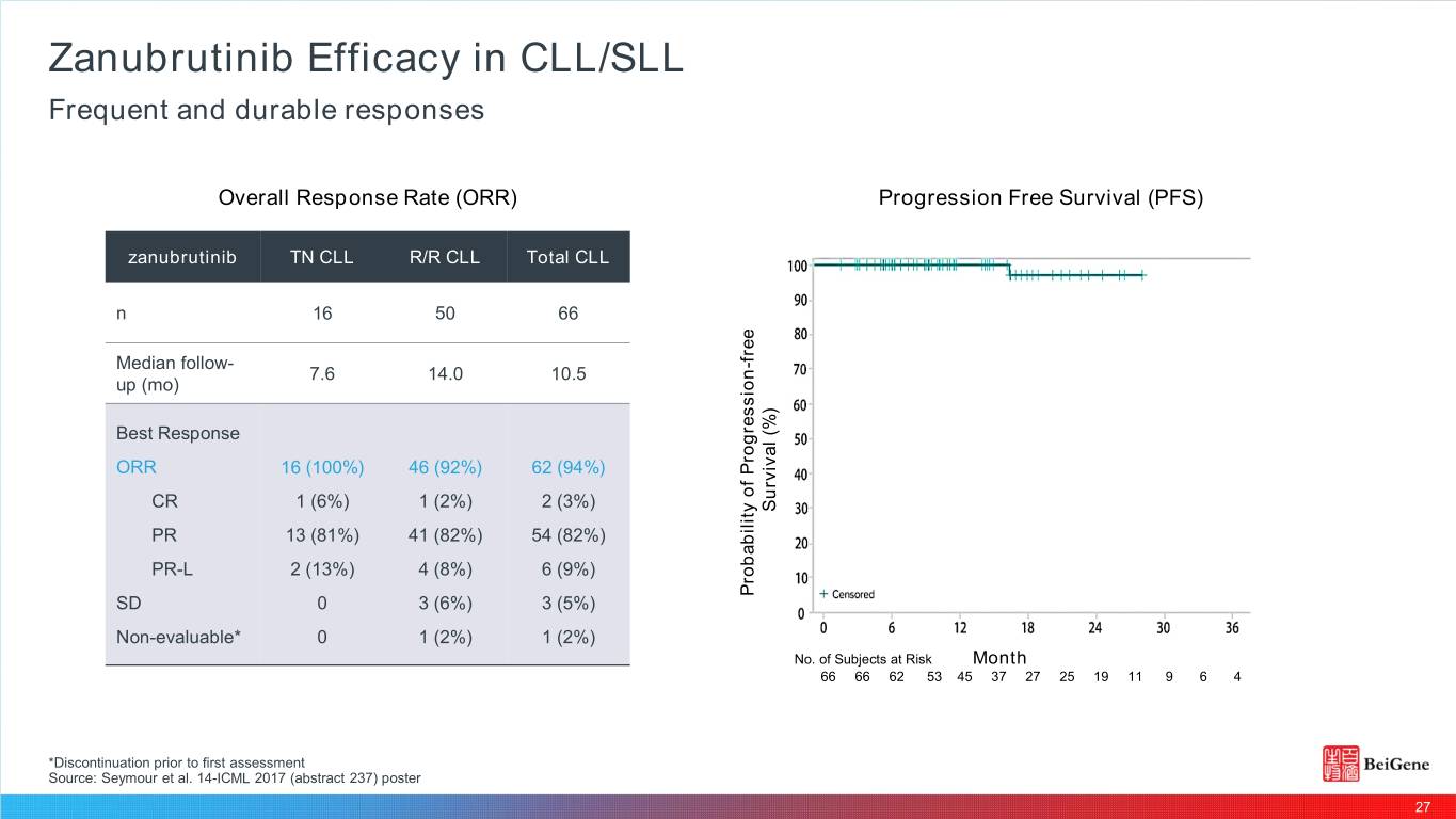 Zanubrutinib Efficacy in CLL/SLL Frequent and durable responses Overall Response Rate (ORR) Progression Free Survival (PFS) zanubrutinib TN CLL R/R CLL Total CLL n 16 50 66 free Median follow- - 7.6 14.0 10.5 up (mo) Best Response ORR 16 (100%) 46 (92%) 62 (94%) CR 1 (6%) 1 (2%) 2 (3%) Survival (%) Survival PR 13 (81%) 41 (82%) 54 (82%) PR-L 2 (13%) 4 (8%) 6 (9%) SD 0 3 (6%) 3 (5%) of ProgressionProbability Non-evaluable* 0 1 (2%) 1 (2%) No. of Subjects at Risk Month 66 66 62 53 45 37 27 25 19 11 9 6 4 *Discontinuation prior to first assessment Source: Seymour et al. 14-ICML 2017 (abstract 237) poster 27
