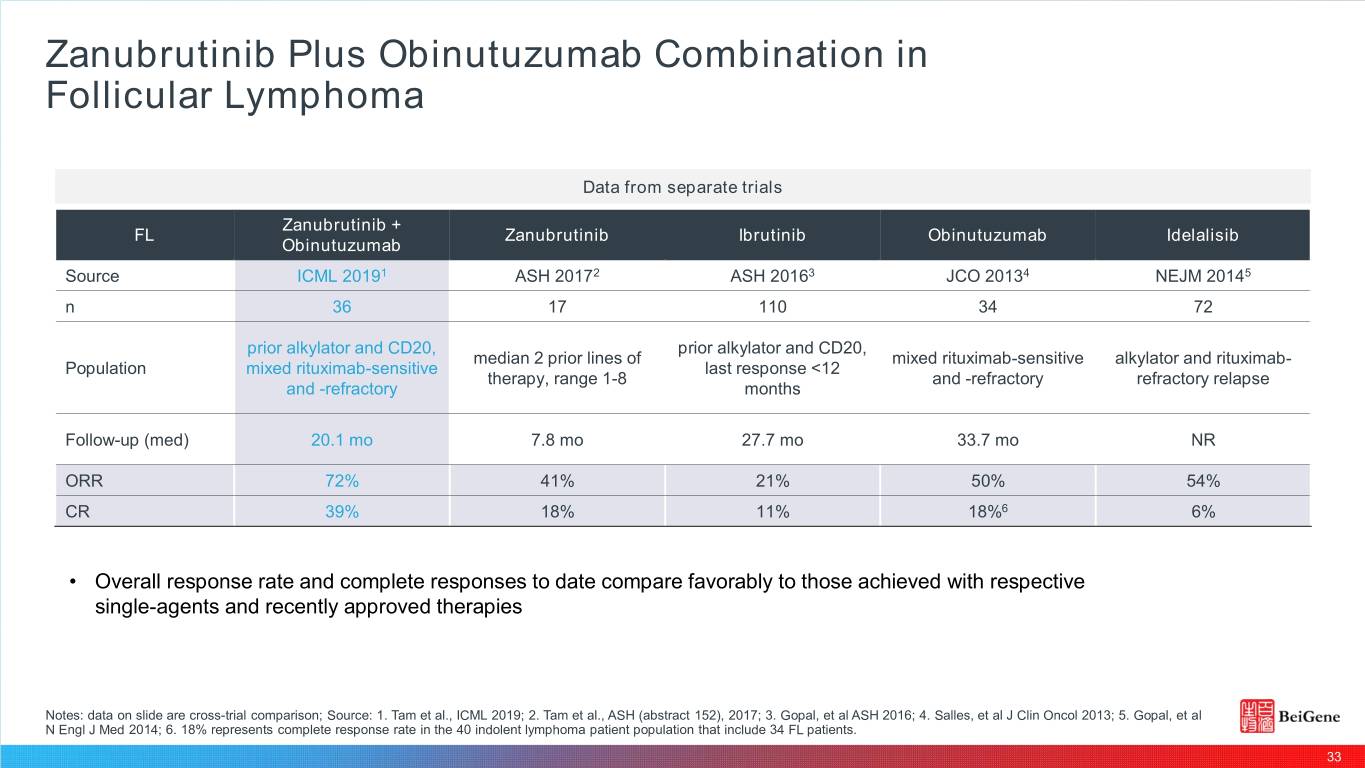 Zanubrutinib Responses Across Additional B-Cell Malignancies MZL MCL MCL FL FL DLBCL China CSCO Source ASH 20171 ICML 20193 pivotal data ASH 20171 ASH 20171 20184 ASH20182 n 9 48 85 17 26 26 Follow-up 7.0 mo 16.7 mo 35.9 wk 7.8 mo 9.5 mo 4.2 mo (med) Prior Lines 2 (1-8) 1 (1-4) 2 (1-4) 2 (1-8) 3 (1-9) 2 (1-10) (med) ORR 78% 85% 84% 41% 42% 31% CR 0 29%* 59%** 18% 8% 15% VGPR -- -- -- -- -- -- PR/PR-L 78% 56% 25% 24% 35% 15% MR -- -- -- -- -- -- • Despite relatively early follow-up, responses were observed in multiple B-cell malignancies • Consistency across tumor types suggests that zanubrutinib is a highly active BTK inhibitor * CT response assessment; ** PET-CT response assessment. Source: 1. Tam et. al., ASH 2017; 2. Song et al., ICML 2019; 3. Tam et al., ICML 2019; 4. Song et. al., CSCO 2018 32