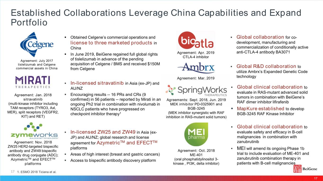 China Enables a Model to Succeed in an Evolving Global Environment BeiGene is uniquely positioned to leverage the large commercial base Dramatic changes to biopharma industry occurring – China increasingly key focal point for future Being able to effectively operate in clinical development in China attracts other U.S. biotech companies to partner with BeiGene, as part of their global development strategy China enables an alternative model for growth, which is no longer reliant on U.S. pricing The large commercial base in China allows more affordable pricing which in turn can be leveraged to provide greater access to high quality drugs globally BeiGene will pursue true global model without sacrificing quality, innovation, or science 16