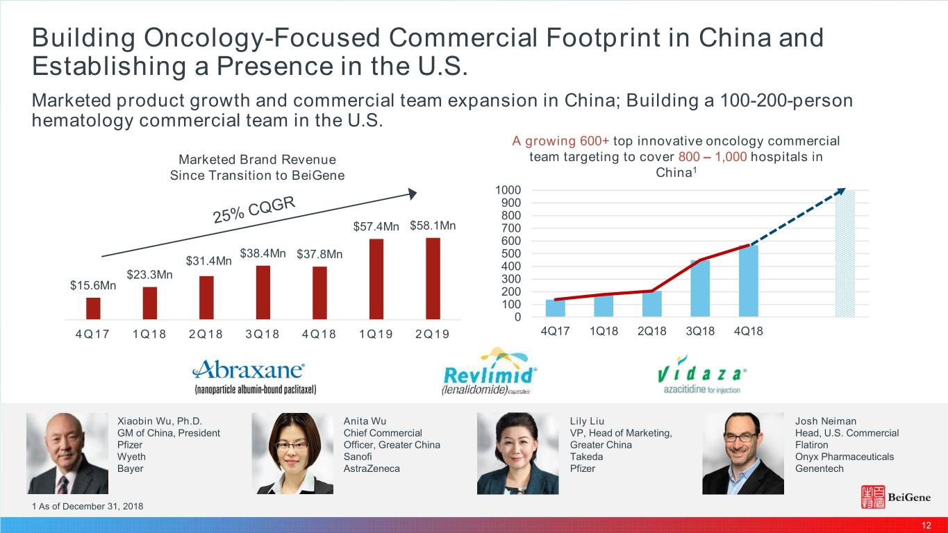 Leverage China to Pursue Global Excellence BeiGene Is Becoming a Leader in China-Inclusive Global Clinical-Development • In-house research capability with a team of approximately 300; all three late-stage clinical assets were discovered by BeiGene scientists with potentially differentiating profiles • Additional new targets and potentially first-in-class candidates in earlier stages of development • Clinical team of over 1,000, with over 50% in China and remainder in US, EU, AU; Largest oncology-focused clinical development team in China • Initiated 6 China-inclusive global pivotal studies; 26 pivotal trials or potentially registration-enabling trials ongoing Countries with BeiGene clinical trial sites • 60+ ongoing or planned clinical trials in China and globally with 7,000+ patients and healthy subjects enrolled • Regulatory interactions and monitoring from 20+ countries Source: BeiGene Corporate Presentation – BioCentury China Healthcare Summit 13/14 Nov. 2018 11