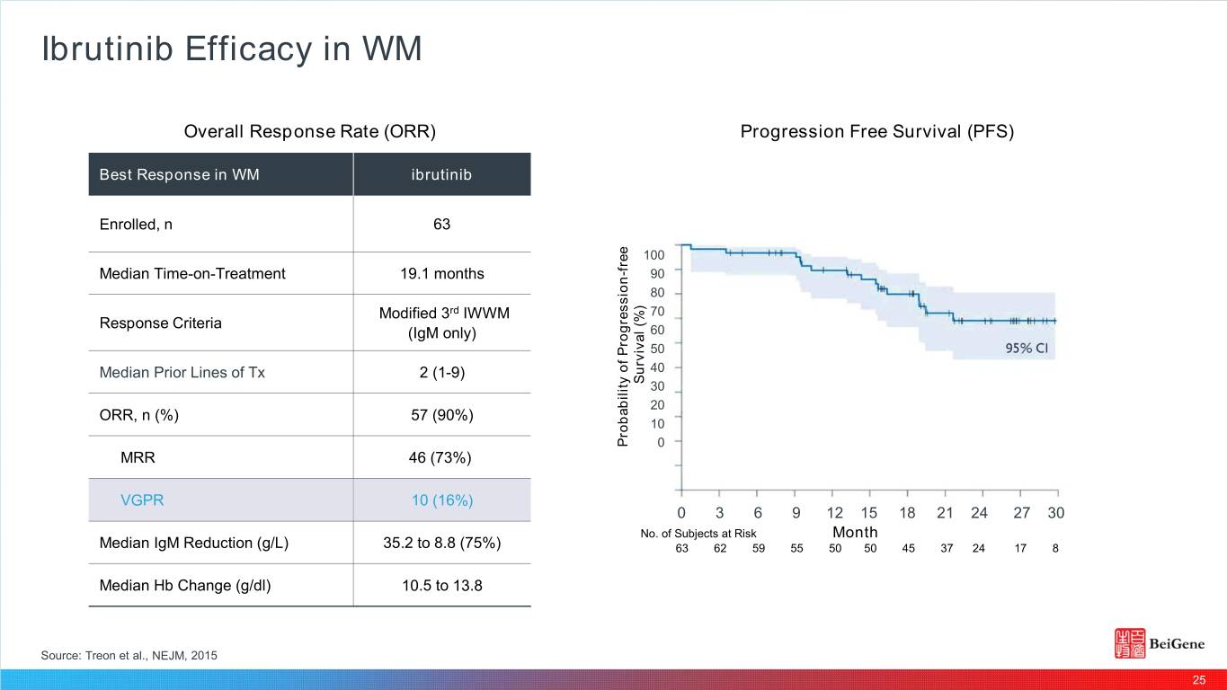 Zanubrutinib Efficacy in WM Favorable response depth and durability Overall Response Rate (ORR) Progression Free Survival (PFS) Best Response in zanubrutinib WM Overall TN RR Evaluable for 73 24 49 efficacy, n 95% CI Median Follow-up 23.9 mo 12.3 mo 24.8 mo Mod. 6th IWWM Response Criteria (IgM decreases only, and not extramedullary disease) Median Prior Lines 0 2 (1-8) of Therapy ORR 92% 96% 90% MRR 82% 87% 78% No. of patients at risk CR/VGPR1 42% 29% 49% PR 40% 58% 31% 1 One R/R patient achieved a CR, TN: treatment naïve; RR: relapsed refractory; Data cutoff 16 September 2018. Source: Trotman et al. EHA 2019 24