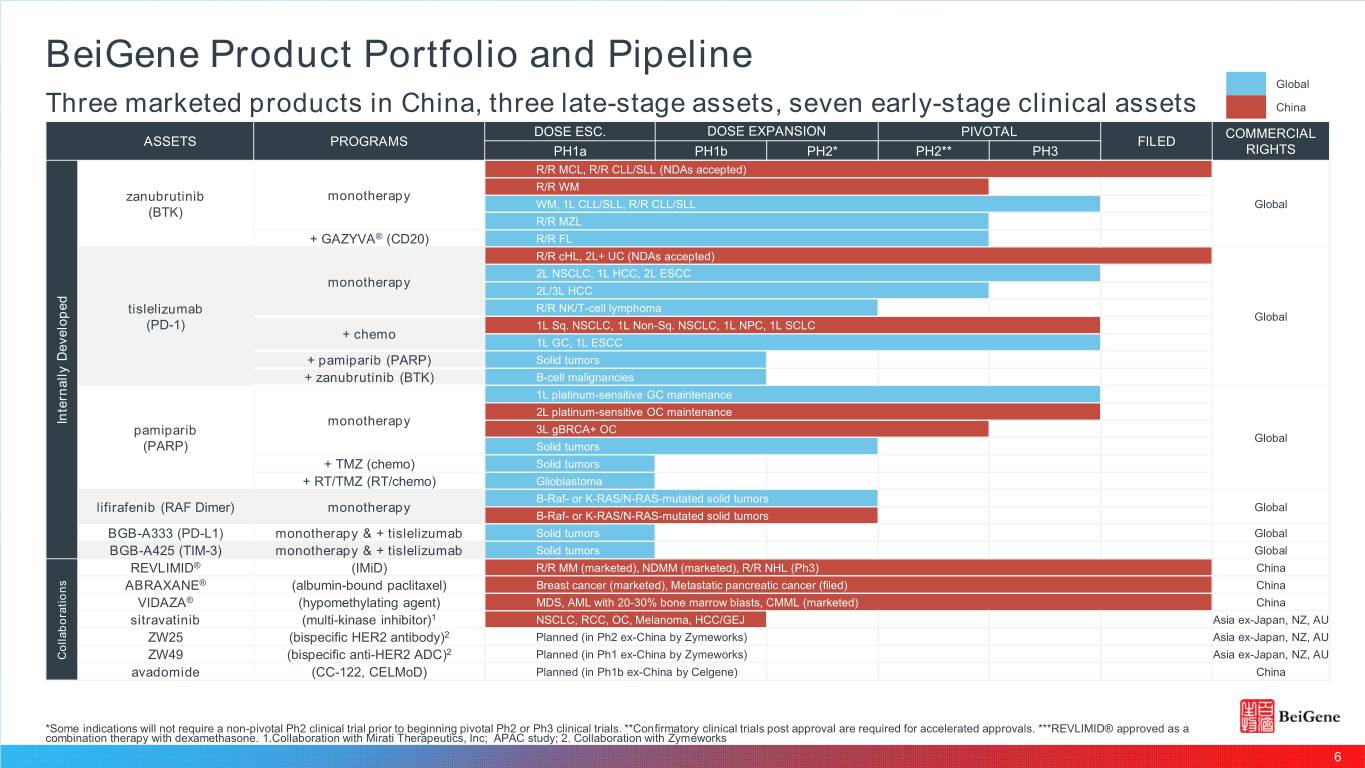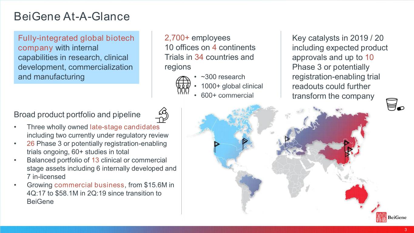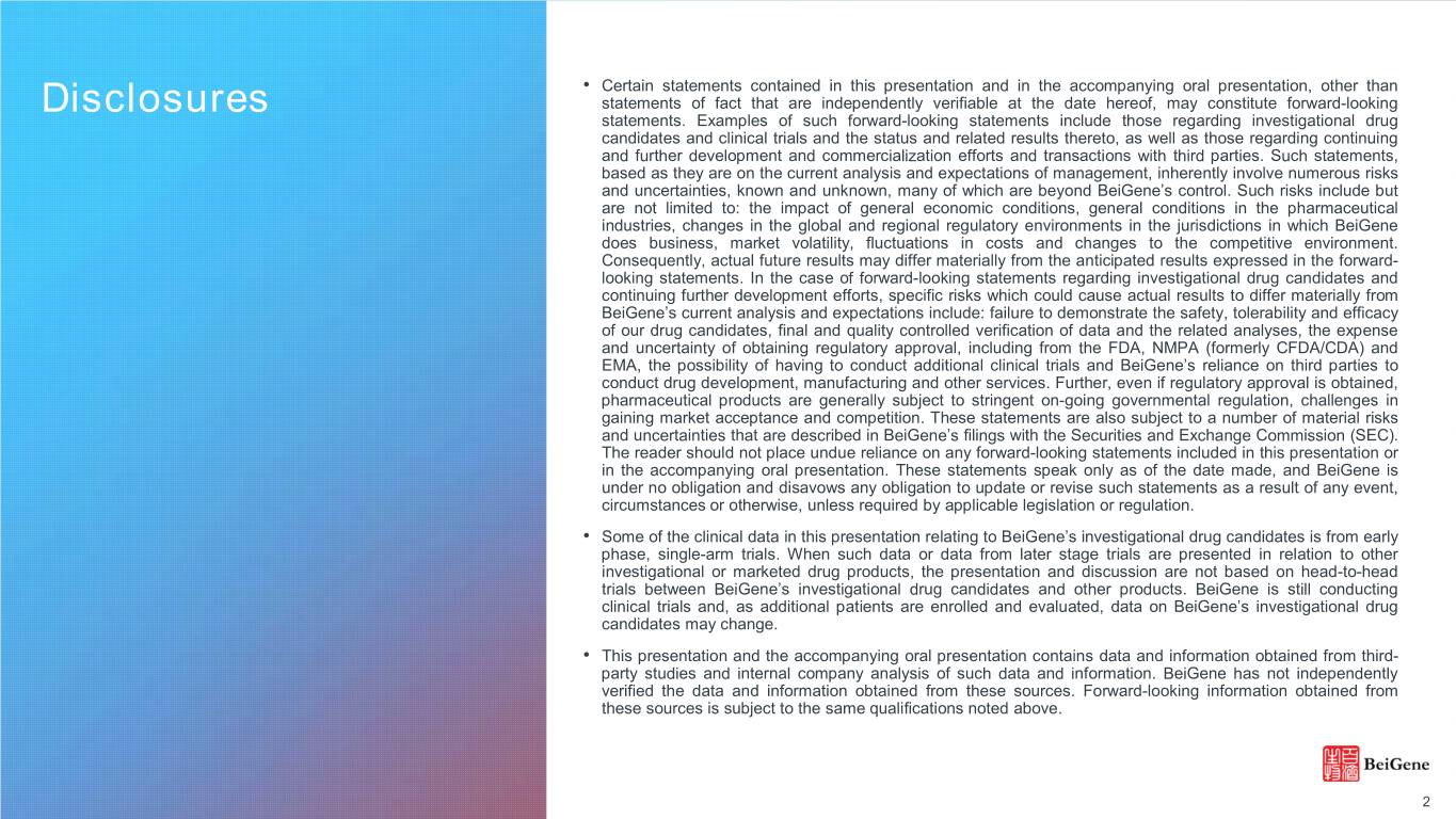 • Certain statements contained in this presentation and in the accompanying oral presentation, other than Disclosures statements of fact that are independently verifiable at the date hereof, may constitute forward-looking statements. Examples of such forward-looking statements include those regarding investigational drug candidates and clinical trials and the status and related results thereto, as well as those regarding continuing and further development and commercialization efforts and transactions with third parties. Such statements, based as they are on the current analysis and expectations of management, inherently involve numerous risks and uncertainties, known and unknown, many of which are beyond BeiGene’s control. Such risks include but are not limited to: the impact of general economic conditions, general conditions in the pharmaceutical industries, changes in the global and regional regulatory environments in the jurisdictions in which BeiGene does business, market volatility, fluctuations in costs and changes to the competitive environment. Consequently, actual future results may differ materially from the anticipated results expressed in the forward- looking statements. In the case of forward-looking statements regarding investigational drug candidates and continuing further development efforts, specific risks which could cause actual results to differ materially from BeiGene’s current analysis and expectations include: failure to demonstrate the safety, tolerability and efficacy of our drug candidates, final and quality controlled verification of data and the related analyses, the expense and uncertainty of obtaining regulatory approval, including from the FDA, NMPA (formerly CFDA/CDA) and EMA, the possibility of having to conduct additional clinical trials and BeiGene’s reliance on third parties to conduct drug development, manufacturing and other services. Further, even if regulatory approval is obtained, pharmaceutical products1 are generally subject to stringent on-going governmental regulation, challenges in gaining market acceptance and competition. These statements are also subject to a number of material risks and uncertainties that are described in BeiGene’s filings with the Securities and Exchange Commission (SEC). The reader should not place undue reliance on any forward-looking statements included in this presentation or in the accompanying oral presentation. These statements speak only as of the date made, and BeiGene is under no obligation and disavows any obligation to update or revise such statements as a result of any event, circumstances or otherwise, unless required by applicable legislation or regulation. • Some of the clinical data in this presentation relating to BeiGene’s investigational drug candidates is from early phase, single-arm trials. When such data or data from later stage trials are presented in relation to other investigational or marketed drug products, the presentation and discussion are not based on head-to-head trials between BeiGene’s investigational drug candidates and other products. BeiGene is still conducting clinical trials and, as additional patients are enrolled and evaluated, data on BeiGene’s investigational drug candidates may change. • This presentation and the accompanying oral presentation contains data and information obtained from third- party studies and internal company analysis of such data and information. BeiGene has not independently verified the data and information obtained from these sources. Forward-looking information obtained from these sources is subject to the same qualifications noted above. 2