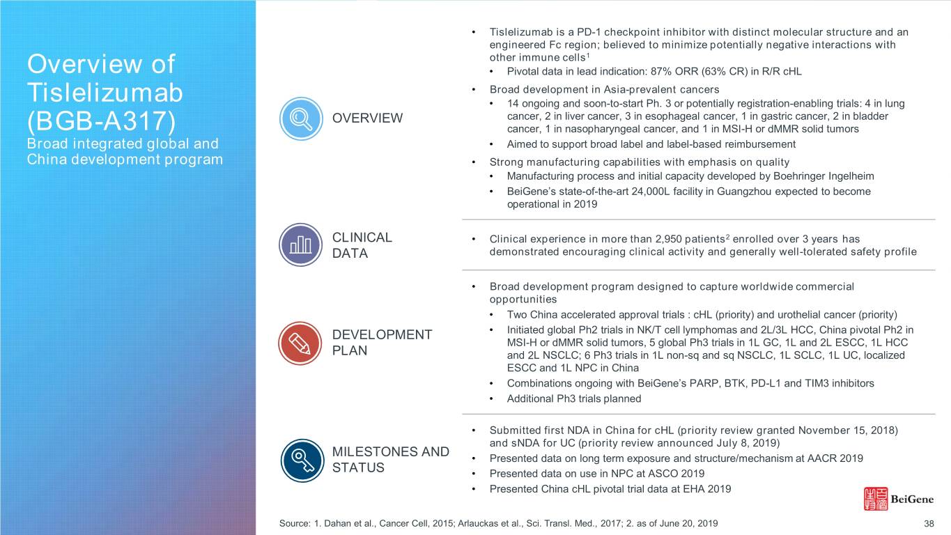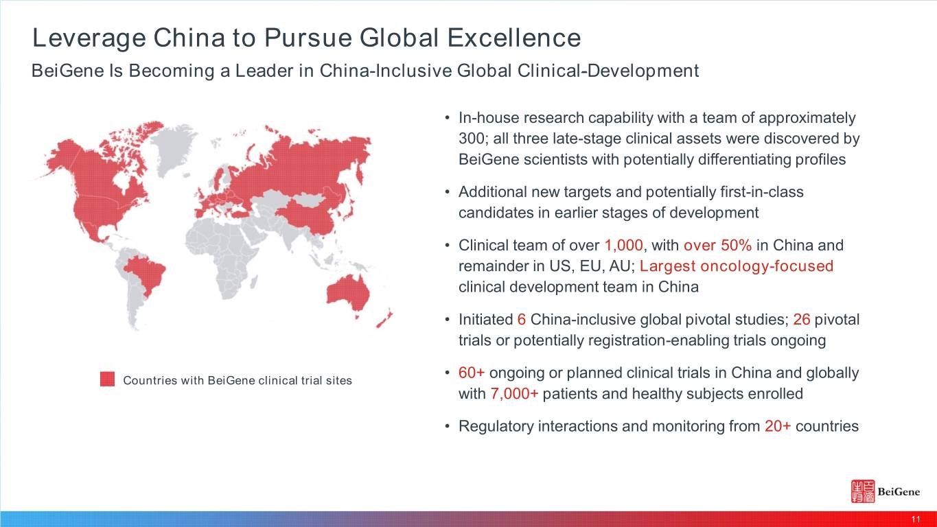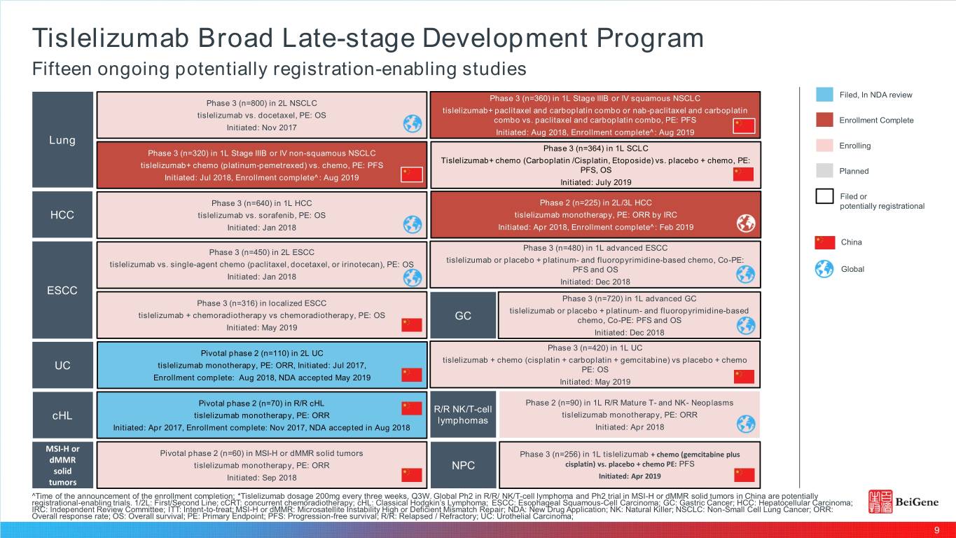 • Certain statements contained in this presentation and in the accompanying oral presentation, other than Disclosures statements of fact that are independently verifiable at the date hereof, may constitute forward-looking statements. Examples of such forward-looking statements include those regarding investigational drug candidates and clinical trials and the status and related results thereto, as well as those regarding continuing and further development and commercialization efforts and transactions with third parties. Such statements, based as they are on the current analysis and expectations of management, inherently involve numerous risks and uncertainties, known and unknown, many of which are beyond BeiGene’s control. Such risks include but are not limited to: the impact of general economic conditions, general conditions in the pharmaceutical industries, changes in the global and regional regulatory environments in the jurisdictions in which BeiGene does business, market volatility, fluctuations in costs and changes to the competitive environment. Consequently, actual future results may differ materially from the anticipated results expressed in the forward- looking statements. In the case of forward-looking statements regarding investigational drug candidates and continuing further development efforts, specific risks which could cause actual results to differ materially from BeiGene’s current analysis and expectations include: failure to demonstrate the safety, tolerability and efficacy of our drug candidates, final and quality controlled verification of data and the related analyses, the expense and uncertainty of obtaining regulatory approval, including from the FDA, NMPA (formerly CFDA/CDA) and EMA, the possibility of having to conduct additional clinical trials and BeiGene’s reliance on third parties to conduct drug development, manufacturing and other services. Further, even if regulatory approval is obtained, pharmaceutical products1 are generally subject to stringent on-going governmental regulation, challenges in gaining market acceptance and competition. These statements are also subject to a number of material risks and uncertainties that are described in BeiGene’s filings with the Securities and Exchange Commission (SEC). The reader should not place undue reliance on any forward-looking statements included in this presentation or in the accompanying oral presentation. These statements speak only as of the date made, and BeiGene is under no obligation and disavows any obligation to update or revise such statements as a result of any event, circumstances or otherwise, unless required by applicable legislation or regulation. • Some of the clinical data in this presentation relating to BeiGene’s investigational drug candidates is from early phase, single-arm trials. When such data or data from later stage trials are presented in relation to other investigational or marketed drug products, the presentation and discussion are not based on head-to-head trials between BeiGene’s investigational drug candidates and other products. BeiGene is still conducting clinical trials and, as additional patients are enrolled and evaluated, data on BeiGene’s investigational drug candidates may change. • This presentation and the accompanying oral presentation contains data and information obtained from third- party studies and internal company analysis of such data and information. BeiGene has not independently verified the data and information obtained from these sources. Forward-looking information obtained from these sources is subject to the same qualifications noted above. 2
