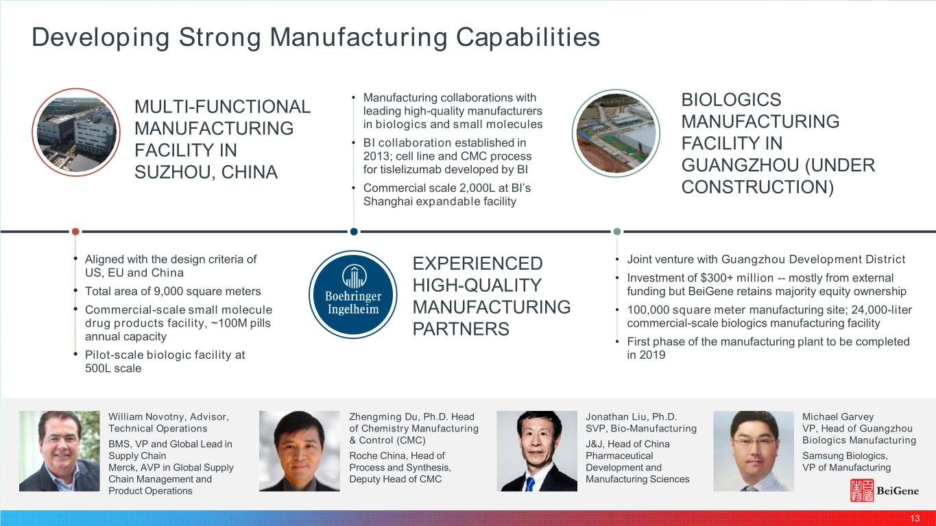 Building Oncology-Focused Commercial Footprint in China and Establishing a Presence in the U.S. Marketed product growth and commercial team expansion in China; Building a 100-200-person hematology commercial team in the U.S. A growing 600+ top innovative oncology commercial Marketed Brand Revenue team targeting to cover 800 – 1,000 hospitals in Since Transition to BeiGene China1 1000 900 800 $57.4Mn $58.1Mn 700 600 $38.4Mn $37.8Mn 500 $31.4Mn 400 $23.3Mn 300 $15.6Mn 200 100 0 4 Q1 7 1 Q1 8 2 Q1 8 3 Q1 8 4 Q1 8 1 Q1 9 2 Q1 9 4Q17 1Q18 2Q18 3Q18 4Q18 Xiaobin Wu, Ph.D. Anita Wu Lily Liu Josh Neiman GM of China, President Chief Commercial VP, Head of Marketing, Head, U.S. Commercial Pfizer Officer, Greater China Greater China Flatiron Wyeth Sanofi Takeda Onyx Pharmaceuticals Bayer AstraZeneca Pfizer Genentech 1 As of December 31, 2018 12