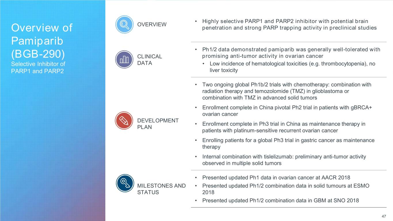 • Highly selective PARP1 and PARP2 inhibitor with potential brain OVERVIEW Overview of penetration and strong PARP trapping activity in preclinical studies Pamiparib • Ph1/2 data demonstrated pamiparib was generally well-tolerated with (BGB-290) CLINICAL promising anti-tumor activity in ovarian cancer Selective Inhibitor of DATA • Low incidence of hematological toxicities (e.g. thrombocytopenia), no PARP1 and PARP2 liver toxicity • Two ongoing global Ph1b/2 trials with chemotherapy: combination with radiation therapy and temozolomide (TMZ) in glioblastoma or combination with TMZ in advanced solid tumors • Enrollment complete in China pivotal Ph2 trial in patients with gBRCA+ ovarian cancer DEVELOPMENT • Enrollment complete in Ph3 trial in China as maintenance therapy in PLAN patients with platinum-sensitive recurrent ovarian cancer • Enrolling patients for a global Ph3 trial in gastric cancer as maintenance therapy • Internal combination with tislelizumab: preliminary anti-tumor activity observed in multiple solid tumors • Presented updated Ph1 data in ovarian cancer at AACR 2018 MILESTONES AND • Presented updated Ph1/2 combination data in solid tumours at ESMO STATUS 2018 • Presented updated Ph1/2 combination data in GBM at SNO 2018 47