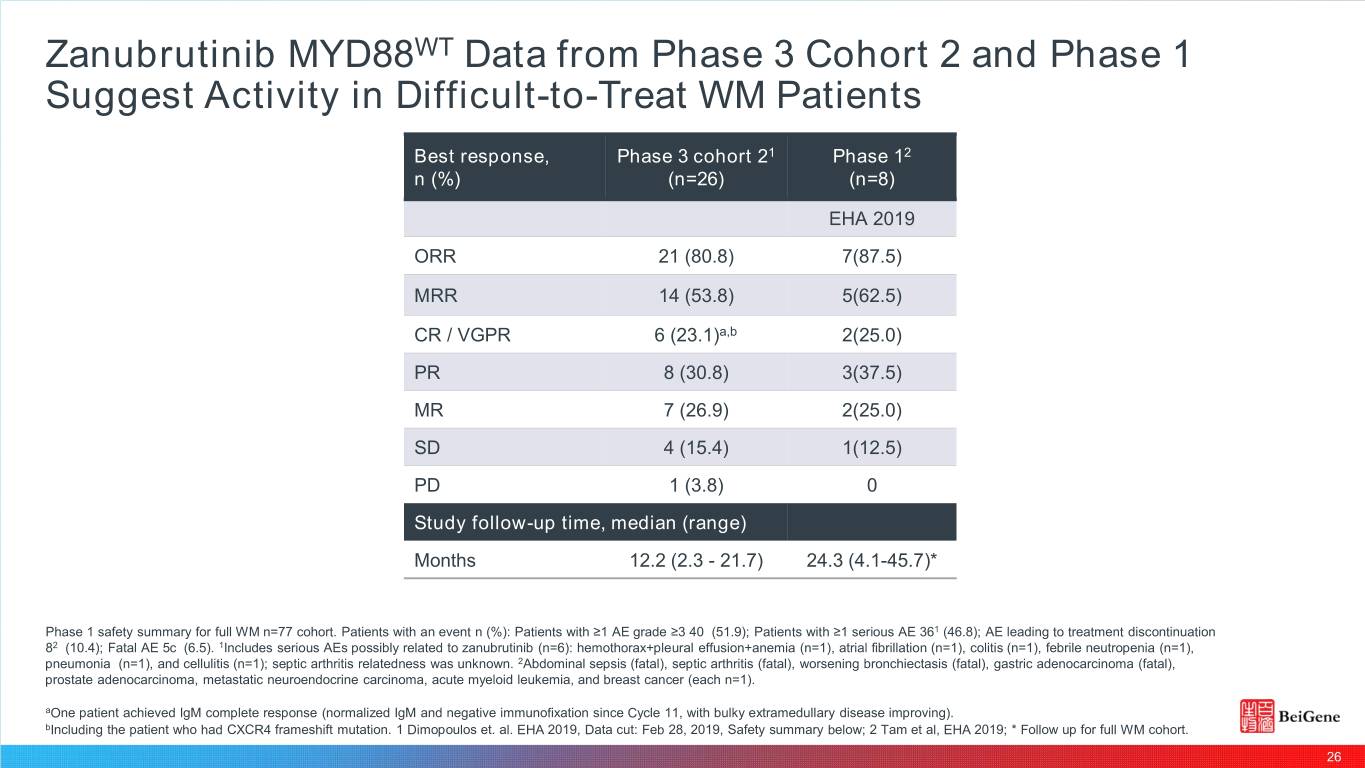 Zanubrutinib MYD88WT Data from Phase 3 Cohort 2 and Phase 1 Suggest Activity in Difficult-to-Treat WM Patients Best response, Phase 3 cohort 21 Phase 12 n (%) (n=26) (n=8) EHA 2019 ORR 21 (80.8) 7(87.5) MRR 14 (53.8) 5(62.5) CR / VGPR 6 (23.1)a,b 2(25.0) PR 8 (30.8) 3(37.5) MR 7 (26.9) 2(25.0) SD 4 (15.4) 1(12.5) PD 1 (3.8) 0 Study follow-up time, median (range) Months 12.2 (2.3 - 21.7) 24.3 (4.1-45.7)* Phase 1 safety summary for full WM n=77 cohort. Patients with an event n (%): Patients with ≥1 AE grade ≥3 40 (51.9); Patients with ≥1 serious AE 361 (46.8); AE leading to treatment discontinuation 82 (10.4); Fatal AE 5c (6.5). 1Includes serious AEs possibly related to zanubrutinib (n=6): hemothorax+pleural effusion+anemia (n=1), atrial fibrillation (n=1), colitis (n=1), febrile neutropenia (n=1), pneumonia (n=1), and cellulitis (n=1); septic arthritis relatedness was unknown. 2Abdominal sepsis (fatal), septic arthritis (fatal), worsening bronchiectasis (fatal), gastric adenocarcinoma (fatal), prostate adenocarcinoma, metastatic neuroendocrine carcinoma, acute myeloid leukemia, and breast cancer (each n=1). aOne patient achieved IgM complete response (normalized IgM and negative immunofixation since Cycle 11, with bulky extramedullary disease improving). bIncluding the patient who had CXCR4 frameshift mutation. 1 Dimopoulos et. al. EHA 2019, Data cut: Feb 28, 2019, Safety summary below; 2 Tam et al, EHA 2019; * Follow up for full WM cohort. 26