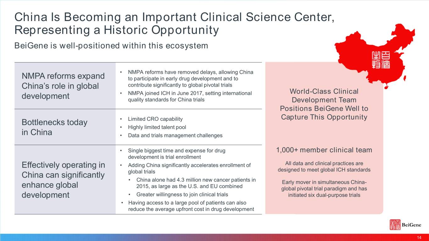 China Is Becoming an Important Clinical Science Center, Representing a Historic Opportunity BeiGene is well-positioned within this ecosystem • NMPA reforms have removed delays, allowing China NMPA reforms expand to participate in early drug development and to China’s role in global contribute significantly to global pivotal trials World-Class Clinical development • NMPA joined ICH in June 2017, setting international quality standards for China trials Development Team Positions BeiGene Well to Capture This Opportunity Bottlenecks today • Limited CRO capability • Highly limited talent pool in China • Data and trials management challenges • Single biggest time and expense for drug 1,000+ member clinical team development is trial enrollment Effectively operating in • Adding China significantly accelerates enrollment of All data and clinical practices are designed to meet global ICH standards China can significantly global trials • China alone had 4.3 million new cancer patients in Early mover in simultaneous China- enhance global 2015, as large as the U.S. and EU combined global pivotal trial paradigm and has development • Greater willingness to join clinical trials initiated six dual-purpose trials • Having access to a large pool of patients can also reduce the average upfront cost in drug development 14