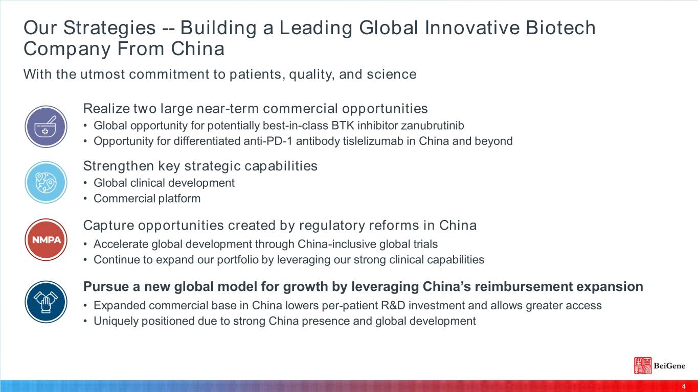BeiGene At-A-Glance Fully-integrated global biotech 2,700+ employees Key catalysts in 2019 / 20 company with internal 10 offices on 4 continents including expected product capabilities in research, clinical Trials in 34 countries and approvals and up to 10 development, commercialization regions Phase 3 or potentially and manufacturing • ~300 research registration-enabling trial • 1000+ global clinical readouts could further • 600+ commercial transform the company Broad product portfolio and pipeline • Three wholly owned late-stage candidates including two currently under regulatory review • 26 Phase 3 or potentially registration-enabling trials ongoing, 60+ studies in total • Balanced portfolio of 13 clinical or commercial stage assets including 6 internally developed and 7 in-licensed • Growing commercial business, from $15.6M in 4Q:17 to $58.1M in 2Q:19 since transition to BeiGene 3