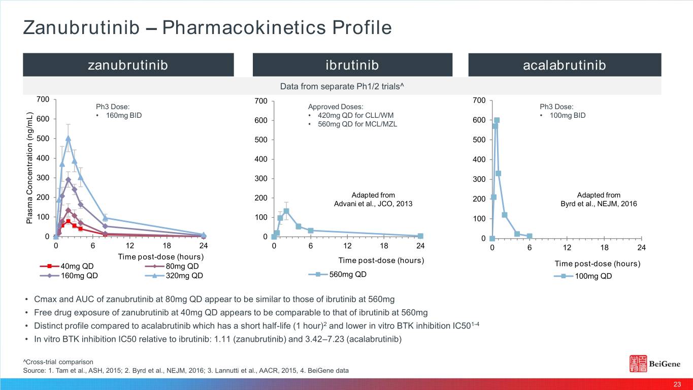 Zanubrutinib Clinical Program Global China DOSE ESCALATION DOSE EXPANSION PIVOTAL PROGRAM (TARGET) FILED PH1a PH1b PH2* PH2** PH3 R/R CLL/SLL (NDA Accepted) R/R MCL (NDA accepted) WM: zanubrutinib vs. ibrutinib, ASPEN TN CLL/SLL: zanubrutinib vs. BR, SEQUOIA zanubrutinib R/R CLL/SLL: zanubrutinib vs. ibrutinib, ALPINE (BGB-3111, BTK) Planned: 1L MCL: zanubrutinib + R vs. BR R/R MZL4 R/R WM R/R DLBCL B-cell malignancies R/R FL: zanubrutinib + GAZYVA® vs. GAZYVA® + GAZYVA® (CD20) B-cell malignancies + GAZYVA® + venetoclax (CD20 TN CLL/SLL + BCL2) + tislelizumab (PD-1) Hematological tumors + ME-401 (PI3K delta) R/R CLL/SLL or B-cell malignancies More than 1,450 patients3 treated with zanubrutinib across program, including combination trials. 1. Some indications will not require a non-pivotal Ph2 clinical trial prior to beginning pivotal Ph2 or Ph3 clinical trials. 2. Confirmatory clinical trials post approval are required for accelerated approvals. 3. as of August 7, 2019. 4. global study and potentially registration-enabling in certain countries; DLBCL: Diffuse Large B-cell Lymphoma 22