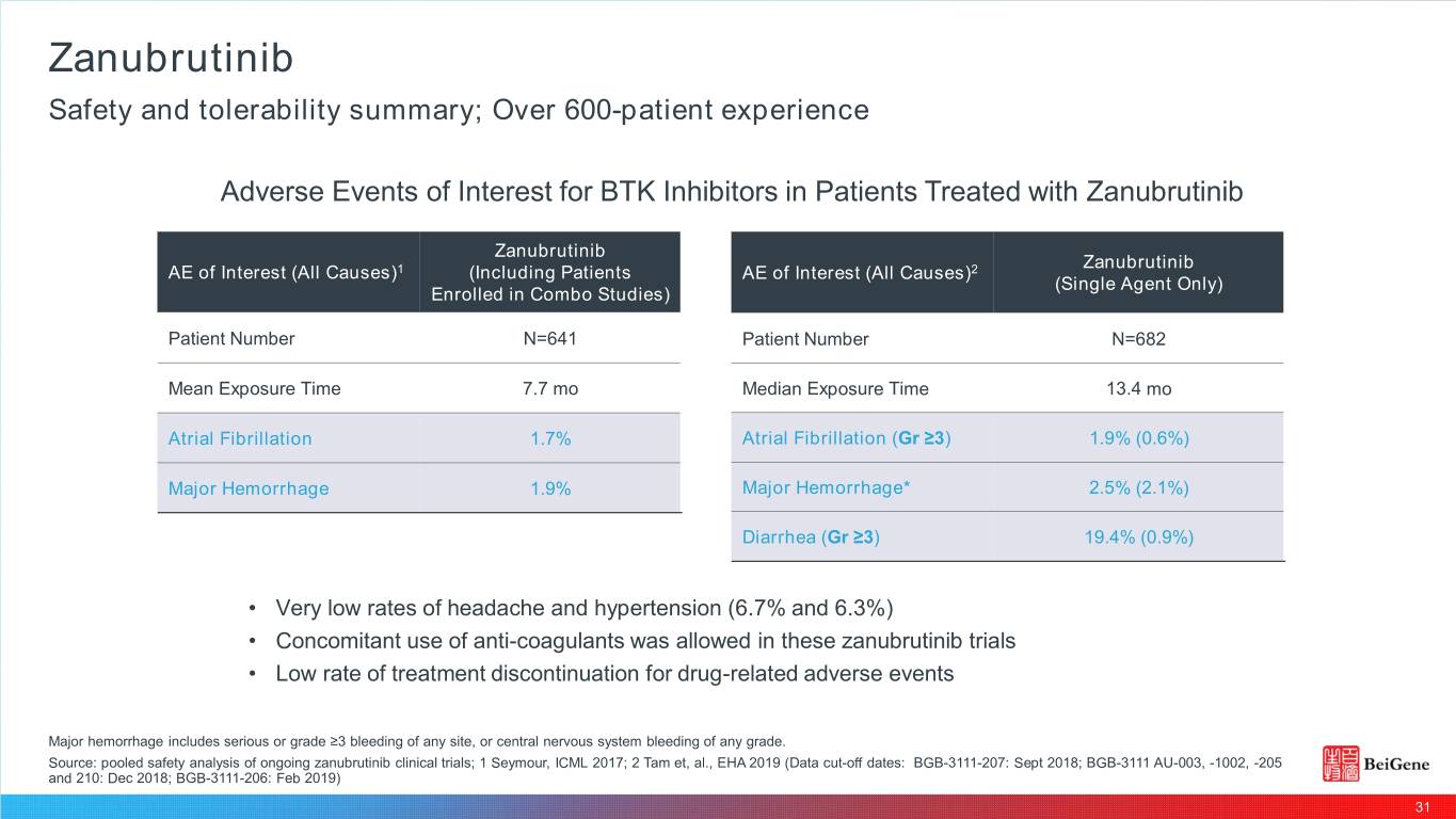 Zanubrutinib Discontinuation for toxicity or progression in CLL/SLL is uncommon Treatment-Naïve (n=18) Relapsed/Refractory (n=51) Total (n=69) Median Follow-Up 10.3 months Total Treatment D/C 0 (0%) 2 (4%) 2 (3%) Toxicity/Tolerability 0 (0%) 1 (2%) 1 (1%) CLL/SLL Progression 0 (0%) 0 (0%) 0 (0%) Transformation (RT or HD) 0 (0%) 1 (2%) 1 (1%) Source: Seymour, ICML 2017 30