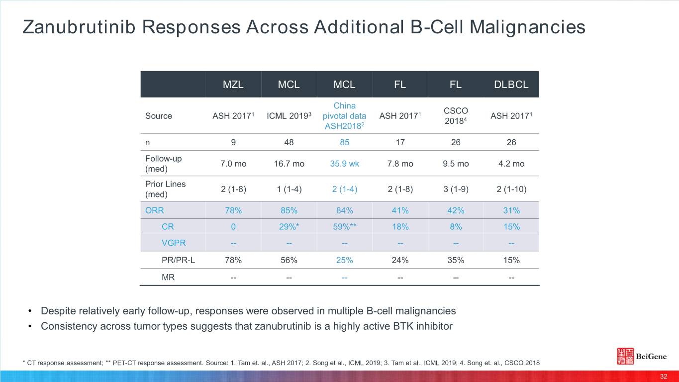 Zanubrutinib Safety and tolerability summary; Over 600-patient experience Adverse Events of Interest for BTK Inhibitors in Patients Treated with Zanubrutinib Zanubrutinib Zanubrutinib AE of Interest (All Causes)1 (Including Patients AE of Interest (All Causes)2 (Single Agent Only) Enrolled in Combo Studies) Patient Number N=641 Patient Number N=682 Mean Exposure Time 7.7 mo Median Exposure Time 13.4 mo Atrial Fibrillation 1.7% Atrial Fibrillation (Gr ≥3) 1.9% (0.6%) Major Hemorrhage 1.9% Major Hemorrhage* 2.5% (2.1%) Diarrhea (Gr ≥3) 19.4% (0.9%) • Very low rates of headache and hypertension (6.7% and 6.3%) • Concomitant use of anti-coagulants was allowed in these zanubrutinib trials • Low rate of treatment discontinuation for drug-related adverse events Major hemorrhage includes serious or grade ≥3 bleeding of any site, or central nervous system bleeding of any grade. Source: pooled safety analysis of ongoing zanubrutinib clinical trials; 1 Seymour, ICML 2017; 2 Tam et, al., EHA 2019 (Data cut-off dates: BGB-3111-207: Sept 2018; BGB-3111 AU-003, -1002, -205 and 210: Dec 2018; BGB-3111-206: Feb 2019) 31