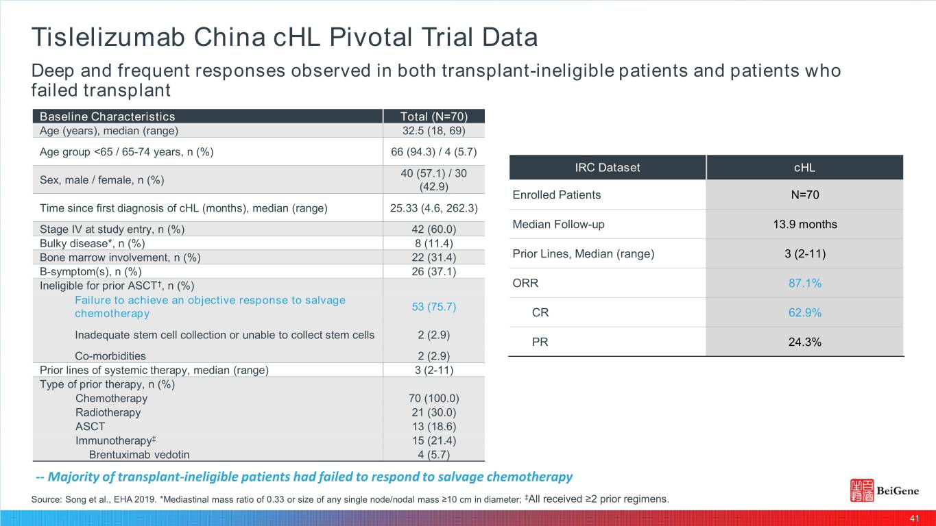 Tislelizumab China cHL Pivotal Trial Data Deep and frequent responses observed in both transplant-ineligible patients and patients who failed transplant Baseline Characteristics Total (N=70) Age (years), median (range) 32.5 (18, 69) Age group <65 / 65-74 years, n (%) 66 (94.3) / 4 (5.7) 40 (57.1) / 30 IRC Dataset cHL Sex, male / female, n (%) (42.9) Enrolled Patients N=70 Time since first diagnosis of cHL (months), median (range) 25.33 (4.6, 262.3) Stage IV at study entry, n (%) 42 (60.0) Median Follow-up 13.9 months Bulky disease*, n (%) 8 (11.4) Bone marrow involvement, n (%) 22 (31.4) Prior Lines, Median (range) 3 (2-11) B-symptom(s), n (%) 26 (37.1) Ineligible for prior ASCT†, n (%) ORR 87.1% Failure to achieve an objective response to salvage 53 (75.7) chemotherapy CR 62.9% Inadequate stem cell collection or unable to collect stem cells 2 (2.9) PR 24.3% Co-morbidities 2 (2.9) Prior lines of systemic therapy, median (range) 3 (2-11) Type of prior therapy, n (%) Chemotherapy 70 (100.0) Radiotherapy 21 (30.0) ASCT 13 (18.6) Immunotherapy‡ 15 (21.4) Brentuximab vedotin 4 (5.7) -- Majority of transplant-ineligible patients had failed to respond to salvage chemotherapy Source: Song et al., EHA 2019. *Mediastinal mass ratio of 0.33 or size of any single node/nodal mass ≥10 cm in diameter; ‡All received ≥2 prior regimens. 41