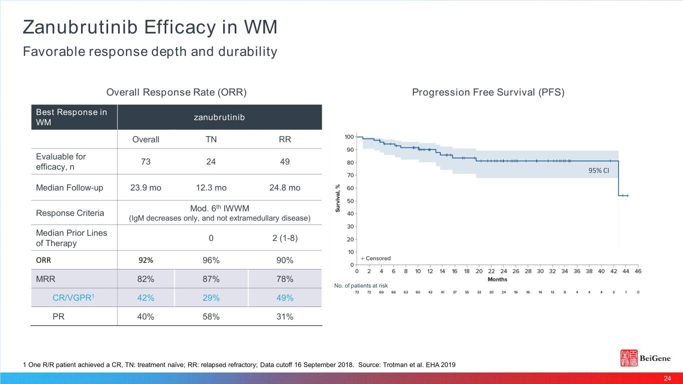 Zanubrutinib – Pharmacokinetics Profile zanubrutinib ibrutinib acalabrutinib Data from separate Ph1/2 trials^ 700 700 700 Ph3 Dose: Approved Doses: Ph3 Dose: • 160mg BID • 420mg QD for CLL/WM • 100mg BID 600 600 600 • 560mg QD for MCL/MZL 500 500 500 400 400 400 300 300 300 200 200 Adapted from 200 Adapted from Advani et al., JCO, 2013 Byrd et al., NEJM, 2016 100 100 100 Plasma Concentration (ng/mL) Concentration Plasma 0 0 0 0 6 12 18 24 0 6 12 18 24 0 6 12 18 24 Time post-dose (hours) Time post-dose (hours) 40mg QD 80mg QD Time post-dose (hours) 160mg QD 320mg QD 560mg QD 100mg QD • Cmax and AUC of zanubrutinib at 80mg QD appear to be similar to those of ibrutinib at 560mg • Free drug exposure of zanubrutinib at 40mg QD appears to be comparable to that of ibrutinib at 560mg • Distinct profile compared to acalabrutinib which has a short half-life (1 hour)2 and lower in vitro BTK inhibition IC501-4 • In vitro BTK inhibition IC50 relative to ibrutinib: 1.11 (zanubrutinib) and 3.42–7.23 (acalabrutinib) ^Cross-trial comparison Source: 1. Tam et al., ASH, 2015; 2. Byrd et al., NEJM, 2016; 3. Lannutti et al., AACR, 2015, 4. BeiGene data 23