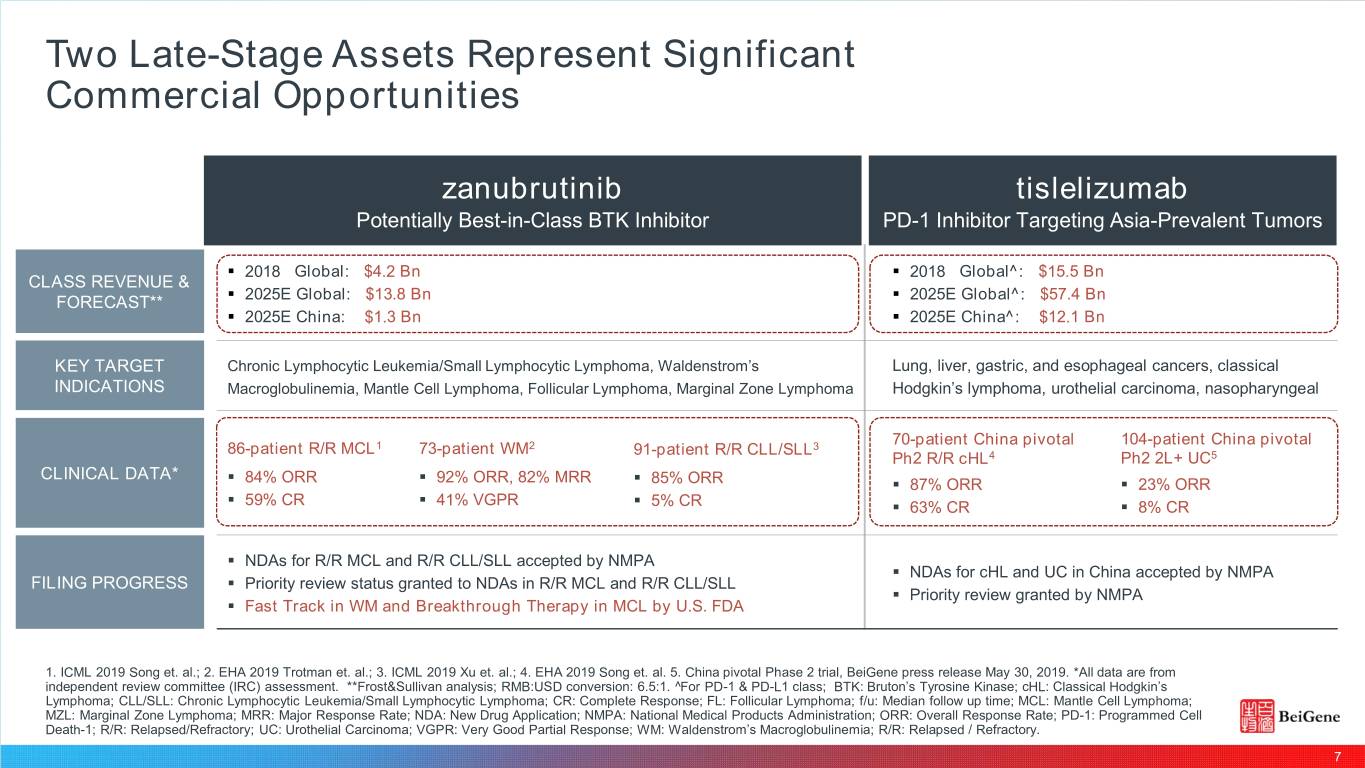 BeiGene Product Portfolio and Pipeline Global Three marketed products in China, three late-stage assets, seven early-stage clinical assets China DOSE ESC. DOSE EXPANSION PIVOTAL COMMERCIAL ASSETS PROGRAMS FILED PH1a PH1b PH2* PH2** PH3 RIGHTS R/R MCL, R/R CLL/SLL (NDAs accepted) R/R WM zanubrutinib monotherapy WM, 1L CLL/SLL, R/R CLL/SLL Global (BTK) R/R MZL + GAZYVA® (CD20) R/R FL R/R cHL, 2L+ UC (NDAs accepted) 2L NSCLC, 1L HCC, 2L ESCC monotherapy 2L/3L HCC tislelizumab R/R NK/T-cell lymphoma Global (PD-1) 1L Sq. NSCLC, 1L Non-Sq. NSCLC, 1L NPC, 1L SCLC + chemo 1L GC, 1L ESCC + pamiparib (PARP) Solid tumors + zanubrutinib (BTK) B-cell malignancies 1L platinum-sensitive GC maintenance 2L platinum-sensitive OC maintenance Internally Internally Developed monotherapy pamiparib 3L gBRCA+ OC Global (PARP) Solid tumors + TMZ (chemo) Solid tumors + RT/TMZ (RT/chemo) Glioblastoma B-Raf- or K-RAS/N-RAS-mutated solid tumors lifirafenib (RAF Dimer) monotherapy Global B-Raf- or K-RAS/N-RAS-mutated solid tumors BGB-A333 (PD-L1) monotherapy & + tislelizumab Solid tumors Global BGB-A425 (TIM-3) monotherapy & + tislelizumab Solid tumors Global REVLIMID® (IMiD) R/R MM (marketed), NDMM (marketed), R/R NHL (Ph3) China ABRAXANE® (albumin-bound paclitaxel) Breast cancer (marketed), Metastatic pancreatic cancer (filed) China VIDAZA® (hypomethylating agent) MDS, AML with 20-30% bone marrow blasts, CMML (marketed) China sitravatinib (multi-kinase inhibitor)1 NSCLC, RCC, OC, Melanoma, HCC/GEJ Asia ex-Japan, NZ, AU ZW25 (bispecific HER2 antibody)2 Planned (in Ph2 ex-China by Zymeworks) Asia ex-Japan, NZ, AU 2 Collaborations ZW49 (bispecific anti-HER2 ADC) Planned (in Ph1 ex-China by Zymeworks) Asia ex-Japan, NZ, AU avadomide (CC-122, CELMoD) Planned (in Ph1b ex-China by Celgene) China *Some indications will not require a non-pivotal Ph2 clinical trial prior to beginning pivotal Ph2 or Ph3 clinical trials. **Confirmatory clinical trials post approval are required for accelerated approvals. ***REVLIMID® approved as a combination therapy with dexamethasone. 1.Collaboration with Mirati Therapeutics, Inc; APAC study; 2. Collaboration with Zymeworks 6