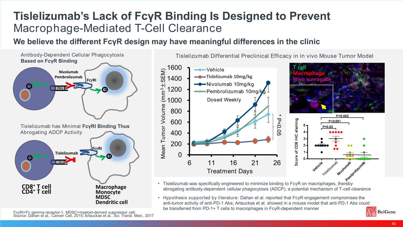 Tislelizumab’s Lack of FcγR Binding Is Designed to Prevent Macrophage-Mediated T-Cell Clearance We believe the different FcγR design may have meaningful differences in the clinic Antibody-Dependent Cellular Phagocytosis Tislelizumab Differential Preclinical Efficacy in in vivo Mouse Tumor Model Based on FcγR Binding 1600 Vehicle T cell Nivolumab Macrophage Pembrolizumab TislelizumabBGB-A317 10mg/kg10mg/kg 1400 Nivo surrogate Fc RI SEM) Nivolumab 10mg/kg - ± + 3 1200 Pembrolizumab 10mg/kg 1000 Dosed Weekly 800 *P<0.05 600 Tislelizumab has Minimal FcγRI Binding Thus Abrogating ADCP Activity 400 200 FcRI Tislelizumab 0 - + MeanTumor Volume (mm 6 11 16 21 26 Treatment Days + • Tislelizumab was specifically engineered to minimize binding to FcγR on macrophages, thereby CD8 T cell Macrophage abrogating antibody-dependent cellular phagocytosis (ADCP), a potential mechanism of T-cell clearance CD4+ T cell Monocyte MDSC • Hypothesis supported by literature: Dahan et al. reported that FcγR engagement compromises the Dendritic cell anti-tumor activity of anti-PD-1 Abs; Arlauckas et al. showed in a mouse model that anti-PD-1 Abs could be transferred from PD-1+ T cells to macrophages in FcγR-dependent manner FcγRI=Fc gamma receptor-1, MDSC=myeloid-derived suppressor cell; Source: Dahan et al., Cancer Cell, 2015; Arlauckas et al., Sci. Transl. Med., 2017 40