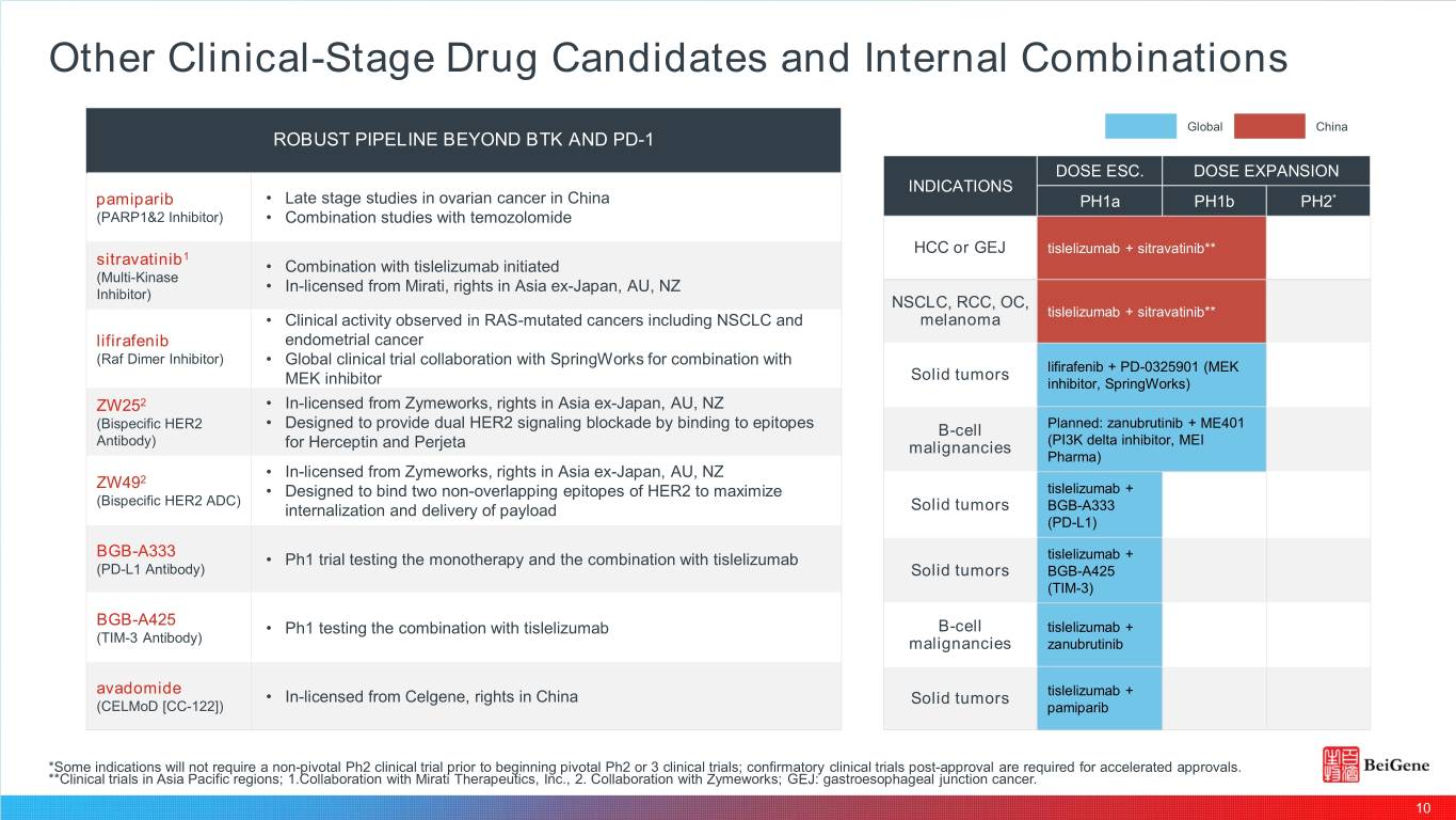 Tislelizumab Broad Late-stage Development Program Fifteen ongoing potentially registration-enabling studies Phase 3 (n=360) in 1L Stage IIIB or IV squamous NSCLC Filed, In NDA review Phase 3 (n=800) in 2L NSCLC tislelizumab+ paclitaxel and carboplatin combo or nab-paclitaxel and carboplatin tislelizumab vs. docetaxel, PE: OS combo vs. paclitaxel and carboplatin combo, PE: PFS Enrollment Complete Initiated: Nov 2017 Initiated: Aug 2018, Enrollment complete^: Aug 2019 Lung Phase 3 (n=364) in 1L SCLC Enrolling Phase 3 (n=320) in 1L Stage IIIB or IV non-squamous NSCLC Tislelizumab+ chemo (Carboplatin /Cisplatin, Etoposide) vs. placebo + chemo, PE: tislelizumab+ chemo (platinum-pemetrexed) vs. chemo, PE: PFS PFS, OS Planned Initiated: Jul 2018, Enrollment complete^: Aug 2019 Initiated: July 2019 Filed or Phase 3 (n=640) in 1L HCC Phase 2 (n=225) in 2L/3L HCC potentially registrational HCC tislelizumab vs. sorafenib, PE: OS tislelizumab monotherapy, PE: ORR by IRC Initiated: Jan 2018 Initiated: Apr 2018, Enrollment complete^: Feb 2019 China Phase 3 (n=480) in 1L advanced ESCC Phase 3 (n=450) in 2L ESCC tislelizumab or placebo + platinum- and fluoropyrimidine-based chemo, Co-PE: tislelizumab vs. single-agent chemo (paclitaxel, docetaxel, or irinotecan), PE: OS PFS and OS Global Initiated: Jan 2018 Initiated: Dec 2018 ESCC Phase 3 (n=720) in 1L advanced GC Phase 3 (n=316) in localized ESCC tislelizumab or placebo + platinum- and fluoropyrimidine-based tislelizumab + chemoradiotherapy vs chemoradiotherapy, PE: OS GC chemo, Co-PE: PFS and OS Initiated: May 2019 Initiated: Dec 2018 Phase 3 (n=420) in 1L UC Pivotal phase 2 (n=110) in 2L UC tislelizumab + chemo (cisplatin + carboplatin + gemcitabine) vs placebo + chemo tislelizumab monotherapy, PE: ORR, Initiated: Jul 2017, UC PE: OS Enrollment complete: Aug 2018, NDA accepted May 2019 Initiated: May 2019 Pivotal phase 2 (n=70) in R/R cHL Phase 2 (n=90) in 1L R/R Mature T- and NK- Neoplasms R/R NK/T-cell tislelizumab monotherapy, PE: ORR tislelizumab monotherapy, PE: ORR cHL lymphomas Initiated: Apr 2017, Enrollment complete: Nov 2017, NDA accepted in Aug 2018 Initiated: Apr 2018 MSI-H or Pivotal phase 2 (n=60) in MSI-H or dMMR solid tumors Phase 3 (n=256) in 1L tislelizumab + chemo (gemcitabine plus dMMR tislelizumab monotherapy, PE: ORR NPC cisplatin) vs. placebo + chemo PE: PFS solid Initiated: Sep 2018 Initiated: Apr 2019 tumors ^Time of the announcement of the enrollment completion; *Tislelizumab dosage 200mg every three weeks, Q3W. Global Ph2 in R/R/ NK/T-cell lymphoma and Ph2 trial in MSI-H or dMMR solid tumors in China are potentially registrational-enabling trials. 1/2L: First/Second Line; cCRT: concurrent chemoradiotherapy; cHL: Classical Hodgkin’s Lymphoma; ESCC: Esophageal Squamous-Cell Carcinoma; GC: Gastric Cancer; HCC: Hepatocellular Carcinoma; IRC: Independent Review Committee; ITT: Intent-to-treat; MSI-H or dMMR: Microsatellite Instability High or Deficient Mismatch Repair; NDA: New Drug Application; NK: Natural Killer; NSCLC: Non-Small Cell Lung Cancer; ORR: Overall response rate; OS: Overall survival; PE: Primary Endpoint; PFS: Progression-free survival; R/R: Relapsed / Refractory; UC: Urothelial Carcinoma; 9
